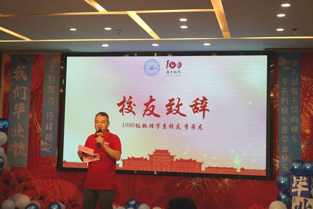 1980级物理学系校友、厦门龙胜达照明有限公司董事长李希龙结合自身成长经历,为毕业生们在明确目标、做好人生规划等方面提出宝贵建议,讲话中饱含着对同学们的深情关切与殷切期望,让即将走出校门的毕业生们更加坚定了对未来发展的信心。
