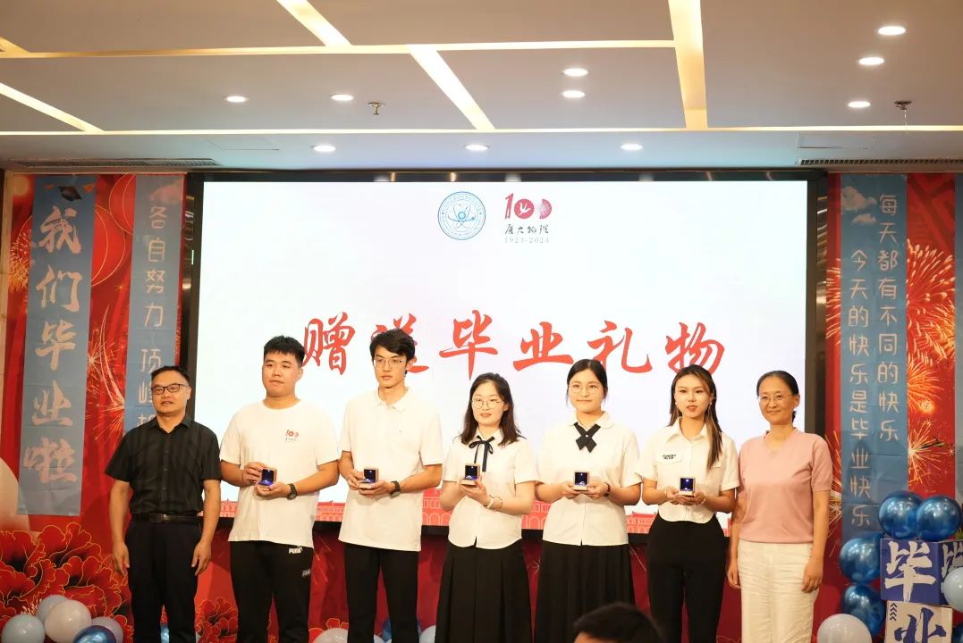 学院党委副书记郑诚明、刘钟南一同为毕业生代表送上精美的莫桑石钻戒。每一枚钻戒都镌刻着同学们的学号,这独一无二的礼物不仅承载着深切的祝福,也象征着毕业生们与母校之间永远的情感纽带。