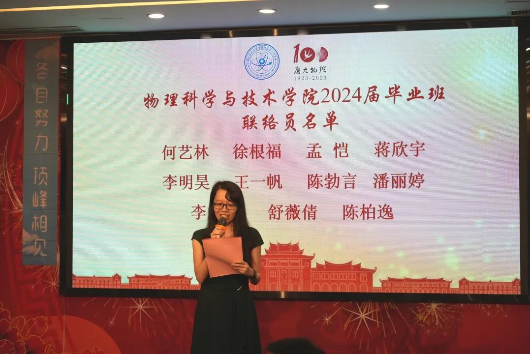 离开厦园后,同学们将增添一个新的身份:厦大物理2024届校友。学院行政秘书许雯雯老师宣读了《2024届毕业班校友工作联络员名单》,鼓励同学们毕业后继续关注母校与学院发展动态,为其发展贡献力量。学院党委书记李书平、院长陈张海为毕业班联络员颁发聘书。