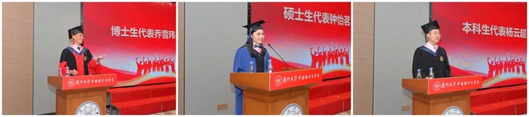 博士生乔雪玮、硕士生钟怡茗、本科生杨云超作为2024届毕业生代表依次发言。他们分享了自己在厦园中难忘的求学和科研经历、成长的感悟心得,并向老师和家长致以衷心的感谢。他们表示对身为厦大人和中文人的一员倍感光荣,并展现出了对新征程的期盼和决心。