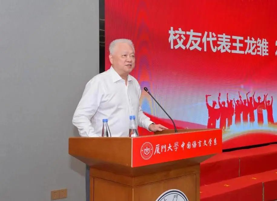 厦门大学中文系杰出校友代表,原厦门象屿集团有限公司党委书记、董事长,现任厦门企业和企业家联合会理事会会长王龙雏分享了自己从走出校园,到步入社会的经验和感想。他表示在厦大中文汲取到的知识与精神是支持他不断前行的力量,希望学弟学妹们培养敢于尝试、把握机遇的人生态度,发扬中文学子特有的人文素养优势,并将之转化为坚持和追求梦想的能力和毅力。