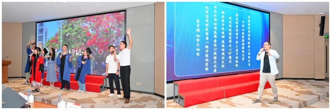 中文系教师代表仲霞、胡行舟,党政管理人员和辅导员代表吴志友、李莹斌,以及五位毕业生和在校生代表为大家带来了优美抒情、别具一格的暖场歌曲《纪念》《那些年》《凤凰花开的路口》等,现场气氛热烈。