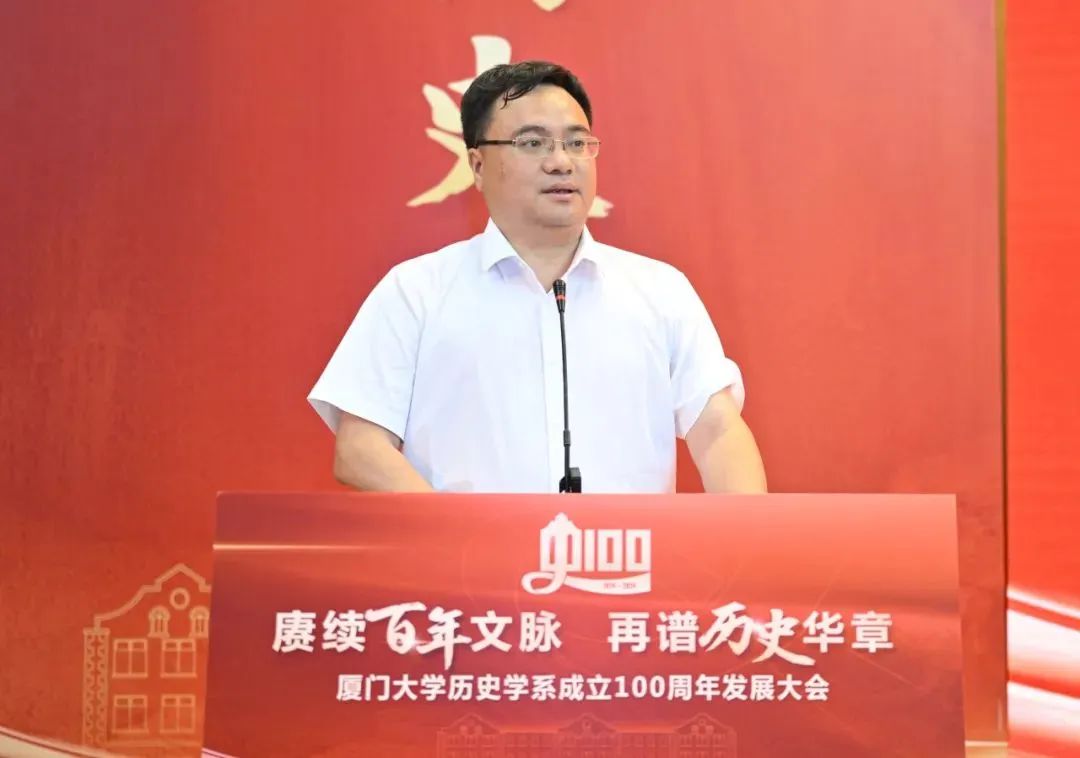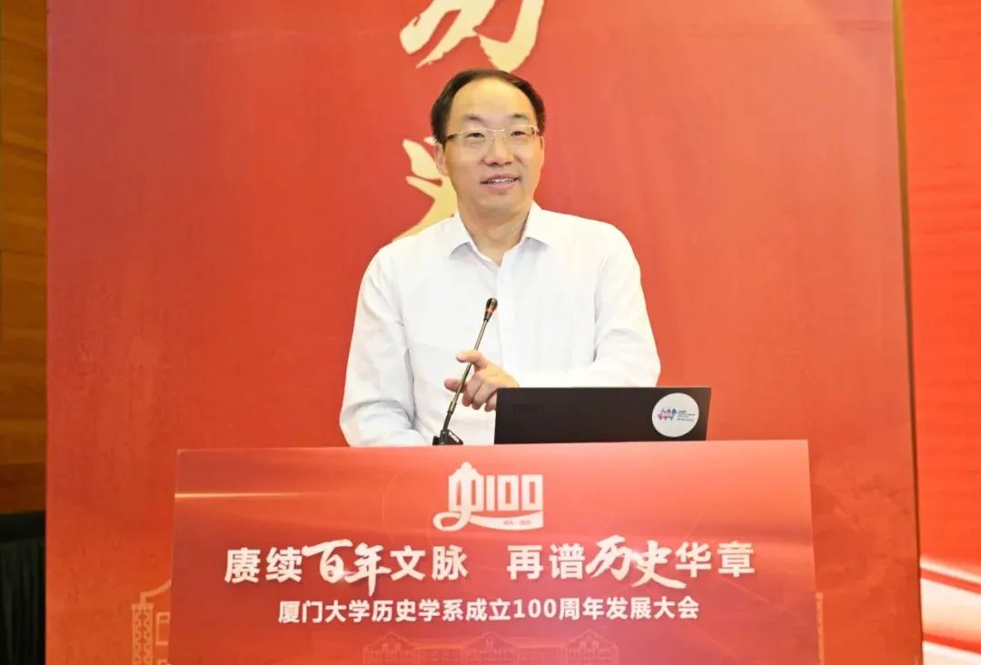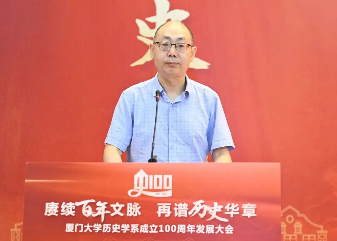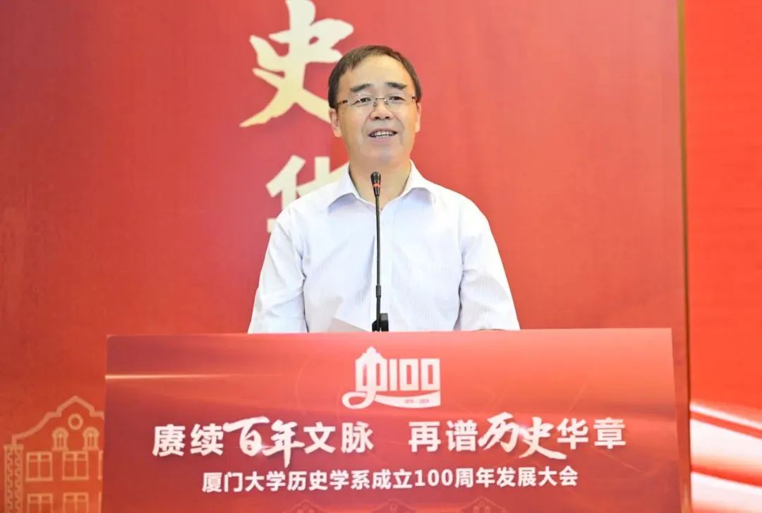 张宗益代表学校向全体师生和广大校友表示热烈祝贺,向与会领导和嘉宾表示诚挚欢迎。“出乎史,入乎道。欲知大道,必先为史。”他高度评价厦门大学历史学系自成立以来取得的发展成就。他指出,历史学科始终与祖国和人民同向同行、与学校发展共荣共进,秉承以史为鉴、以史铸魂、以史育人的初心,传承文脉、开拓进取,逐步发展成为蜚声中外的中国东南史学重镇。一百年来,厦大历史学科继承郑天挺、周予同、顾颉刚、张星烺、林惠祥等著名史学家、考古学家开创的经世致用的史学传统,接续涌现出傅衣凌、韩国磐领衔的“中国社会经济史学派”等闻名遐迩的学术群体,学科发展博纳古今、融通中外,为国家和社会输送了一大批心系黎民天下、胸怀赤诚大爱的优秀人才。他说,站在崭新起点上,历史学科要以习近平总书记致厦门大学建校100周年重要贺信精神为引领,深入贯彻落实习近平总书记关于历史科学的重要论述,赓续优良传统、回应时代关切,守正创新、矢志一流,以史学之道助力中国式现代化,竭力开创历史学科高质量发展的广阔天地。他提出了三点期望:一是厚植育人根基,坚守为党育人、为国育才的初心使命,着力造就更多有家国情怀、有卓识远见、有扎实基础、能引领未来的新时代史学人才;二是推动内涵发展,重视培育冷门绝学、发展新兴领域,加强历史与其他学科交叉融合的新文科建设,探索运用人工智能、大数据等新技术手段,提高学术原始创新能力,建立历史研究新范式;三是扎根祖国大地,充分发挥国家级平台整合引领作用、纵深拓展校地合作,推动史学研究成果创造性转化、创新性发展,进一步提升“知古鉴今,以史资政”的服务能级。