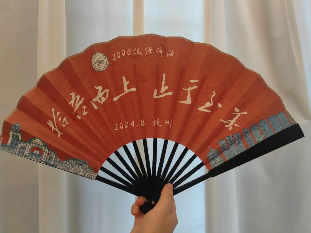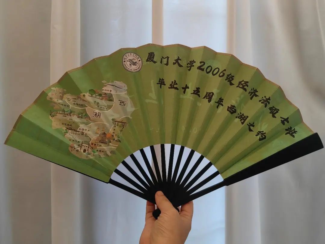筹委会匠心独运,为同学们特别准备了一份满载深情的惊喜礼品——定制折扇。折扇一面为绿,上书“厦大法学院2006级经济法硕士班毕业十五周年西湖之约”,并印有西湖十景的手绘地图;另一面为红,印着厦门和杭州的双城地标,并写有本次聚会的主题“拾吾而上,止于至善”。