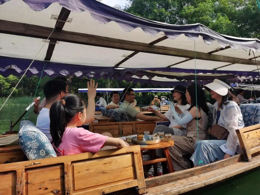 摇橹船穿梭于西湖精致的景观之间,远处山峦,近处苏堤,波光粼粼,鱼群潜底,沿途美景如同一幅幅流动的画卷,在眼前徐徐展开。同学们或轻声交谈,或拍照留念,与三五好友细细品味这清晨的静好。正所谓“未能抛得杭州去,一半勾留是此湖”。