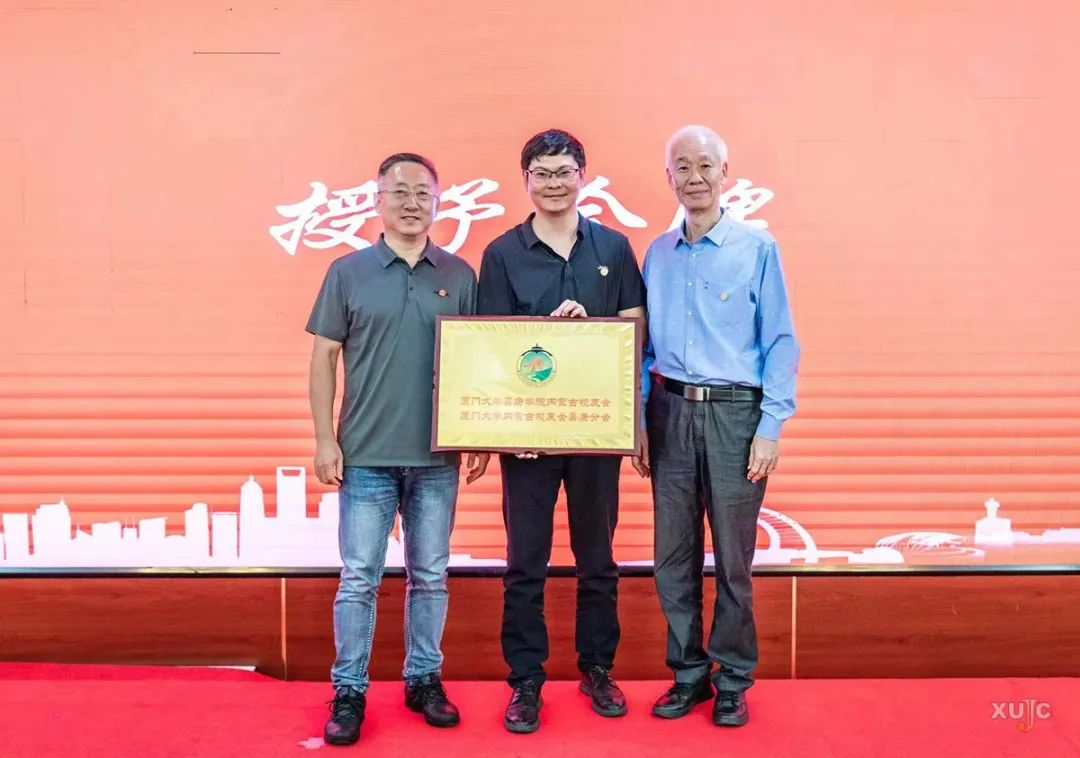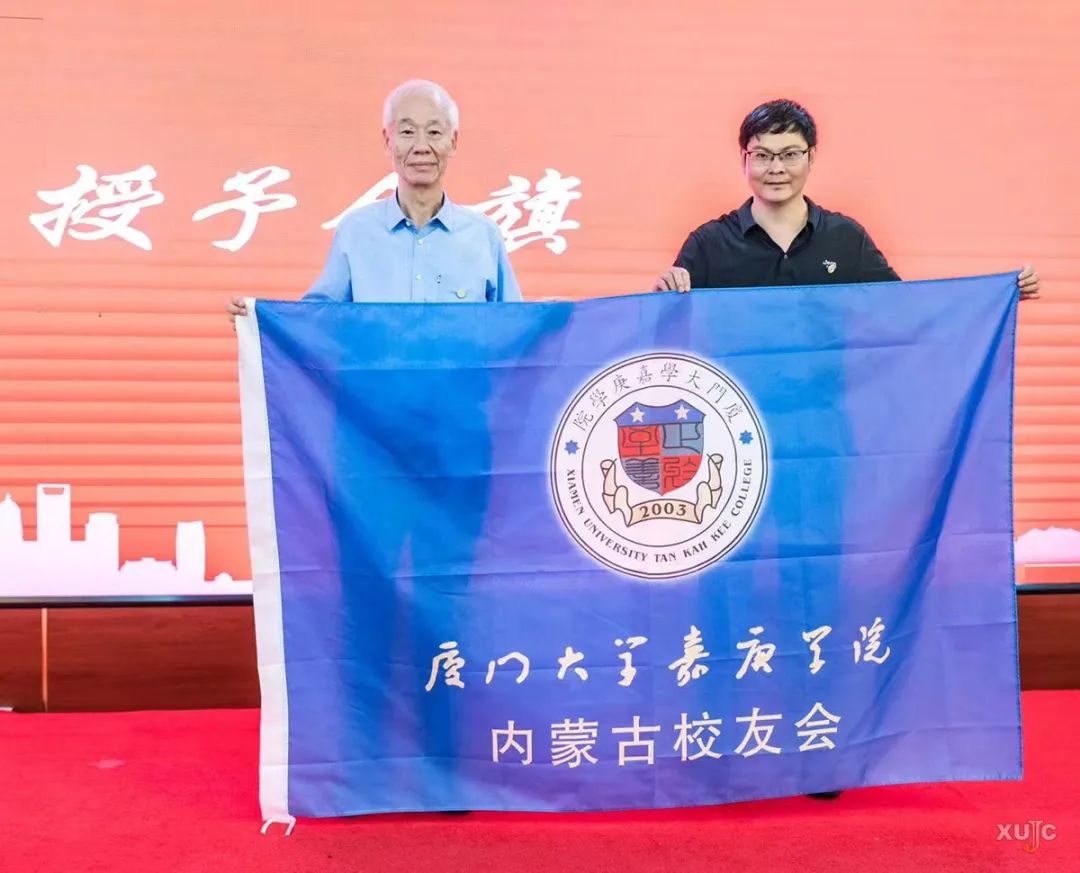 鲁同安向内蒙古校友会授会旗。鲁同安和于树军共同为厦门大学嘉庚学院内蒙古校友会暨厦门大学内蒙古校友会嘉庚学院分会颁发会牌,向新当选的理事会、监事会和秘书处成员颁发聘书。
