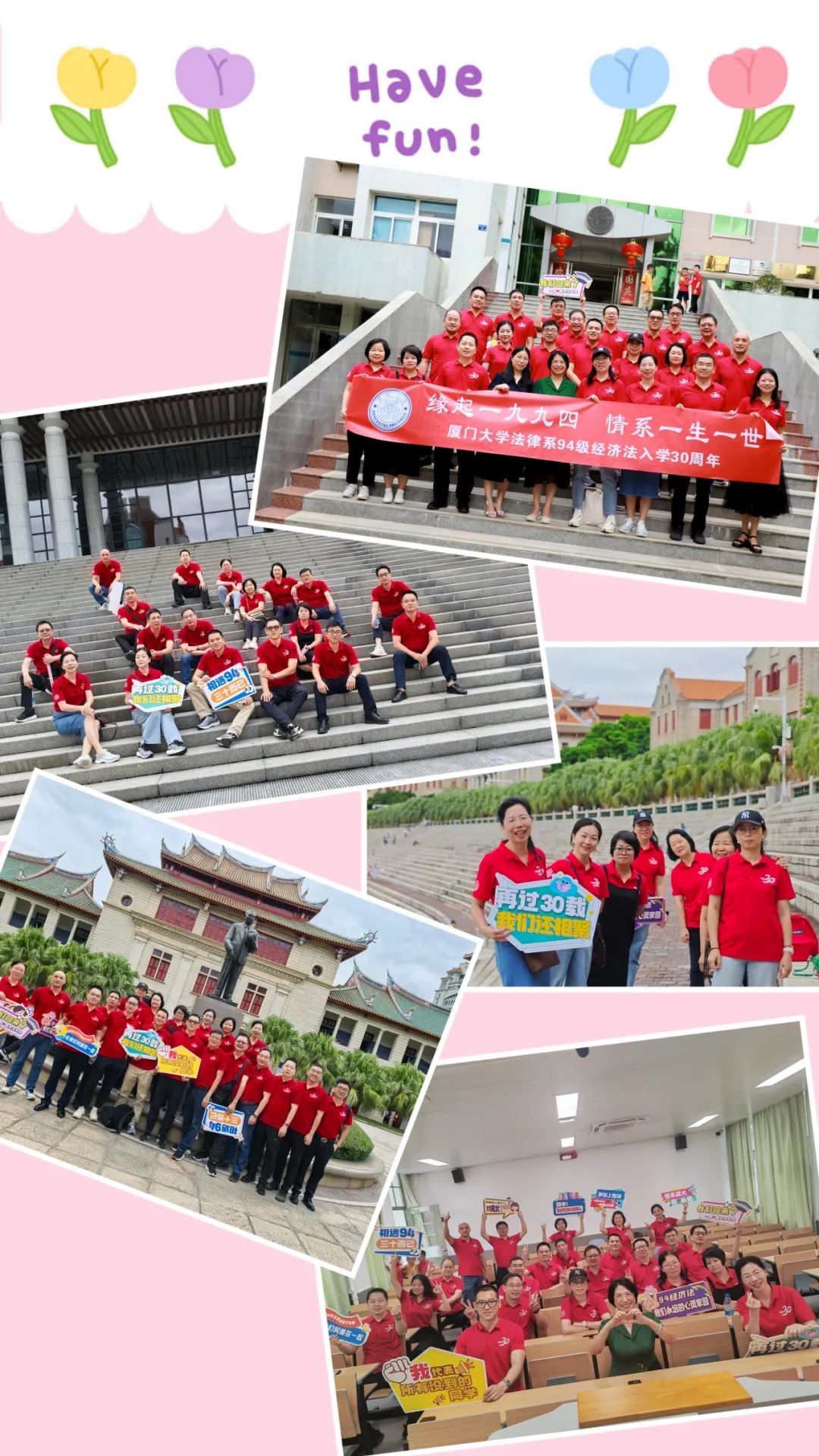 10月2日,1994级经济法班本科校友身着红色文化衫重游校园。校友们特地根据同学们当年的学号和入学30周年两种元素设计了本次返校文化衫胸前的LOGO。他们沿着求学时的轨迹重游校园,瞻仰了校主陈嘉庚先生像,漫步芙蓉湖畔与上弦场,最后抵达法学院。