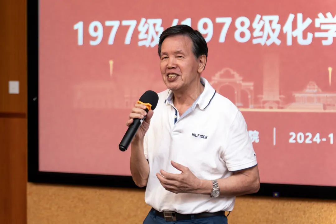 黄如彬回顾了1977、1978级校友为筹备本次返校聚会付出的辛勤努力,分享了自己担任化学系1978级辅导员期间的难忘记忆。他表示,化学系1977、1978级校友涌现出一大批行业翘楚和国家栋梁,自己为能够担任化学系1978级辅导员而感到无比光荣,感谢同学们一直以来的包容、关心和支持,祝福大家健康幸福美满。