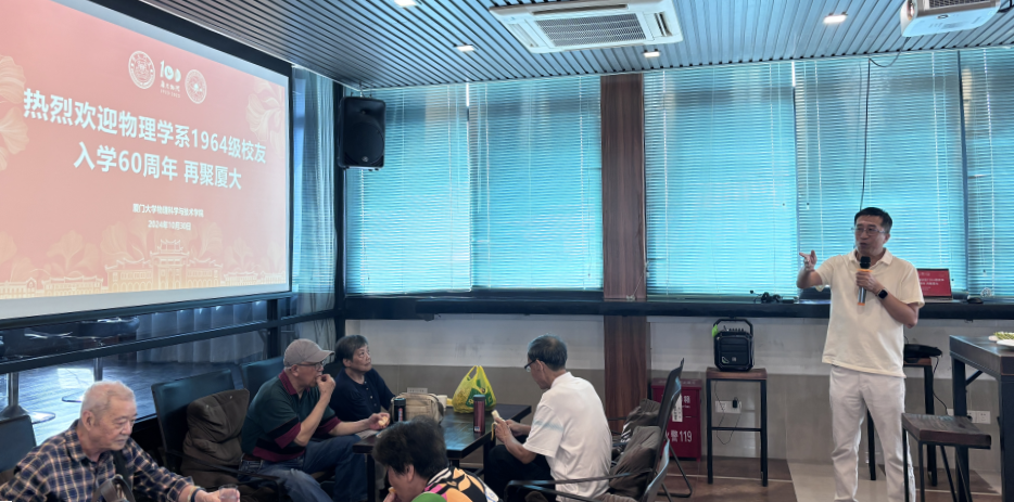 学院校友工作秘书许雯雯介绍学院发展历史与现状,分享厦大物理学科百年庆典盛况与校友活动集锦,并展示64级校友入学花名册及老照片。