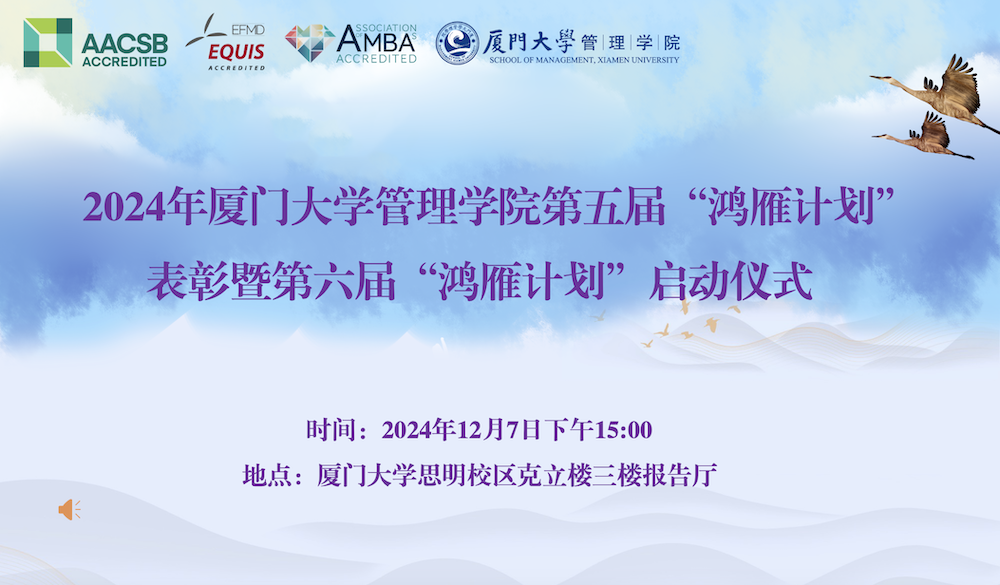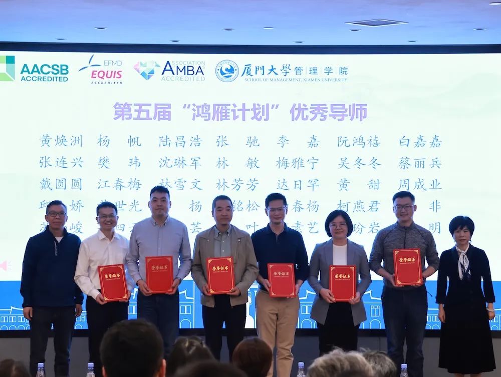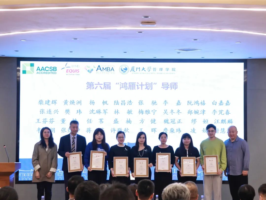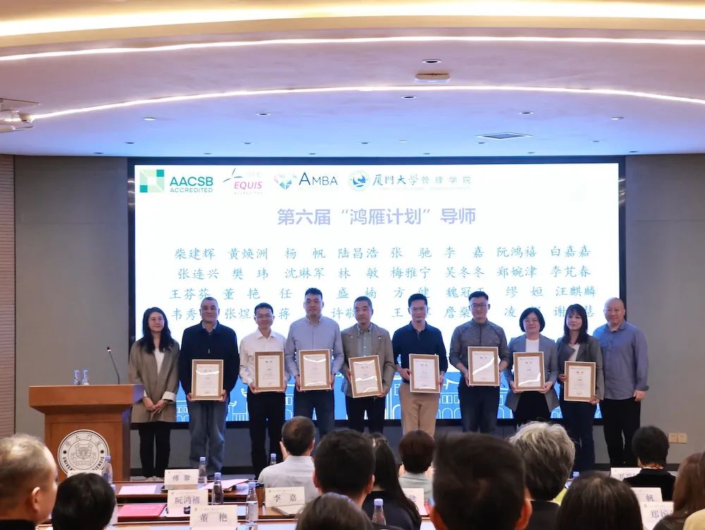 12月7日下午,管理学院第五届“鸿雁计划”优秀导师表彰暨第六届“鸿雁计划”启动仪式在思明校区克立楼三楼报告厅举行。厦门大学校友总会秘书处秘书长王智兰、管理学院党委书记张明智、学生工作部(处)副部(处)长陈国全、管理学院副院长傅馨、管理学院党委副书记郑碧娇、校友总会秘书处联络部主任李绍玉,“鸿雁计划”优秀导师代表、第六届“鸿雁计划”师生代表以及管理学院学生工作办公室、校友与对外合作办公室老师出席了本次活动。仪式由管理学院党委副书记周民钦主持。