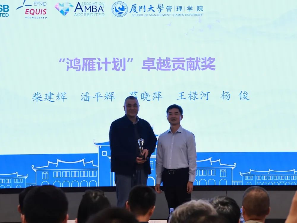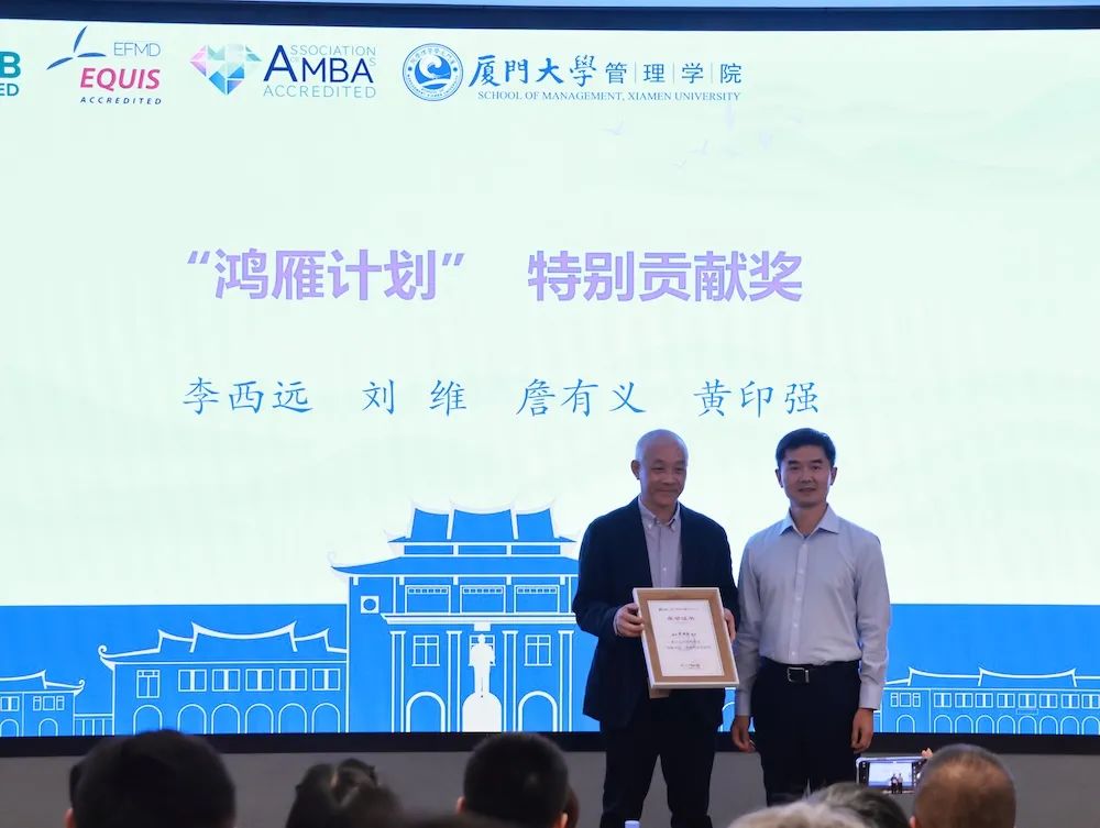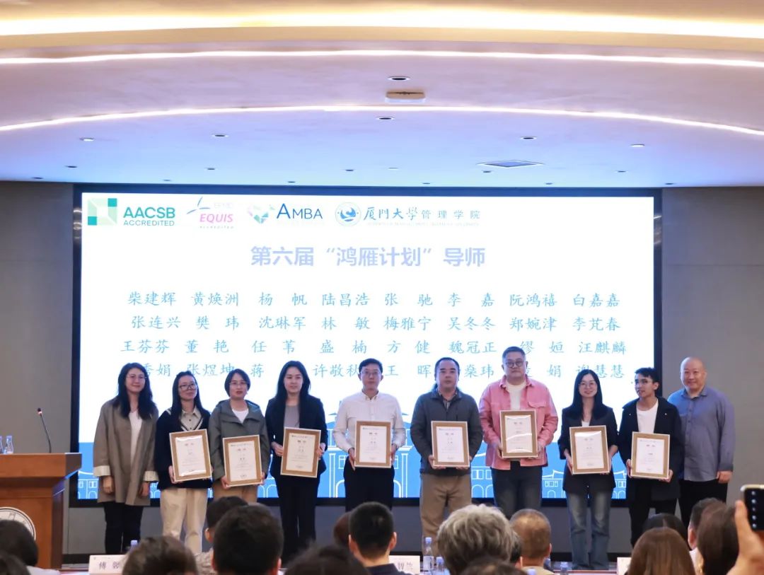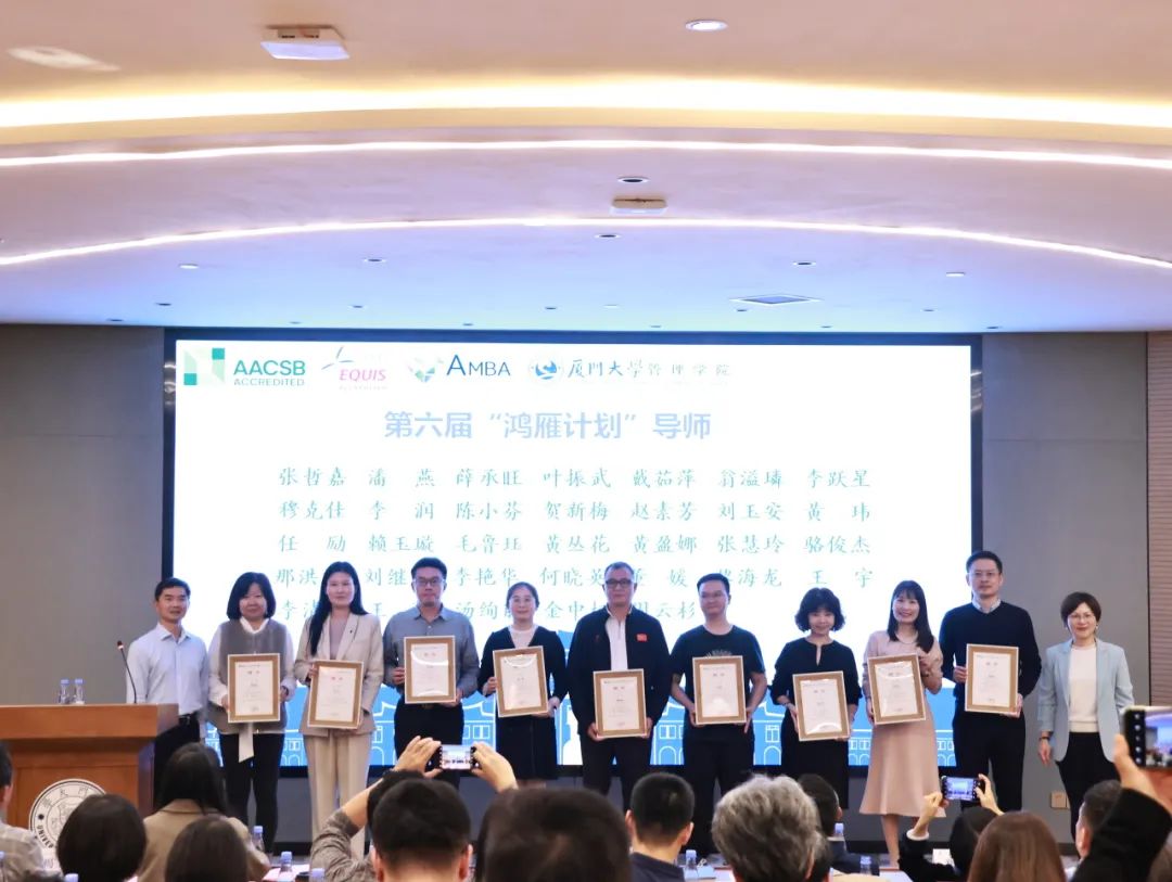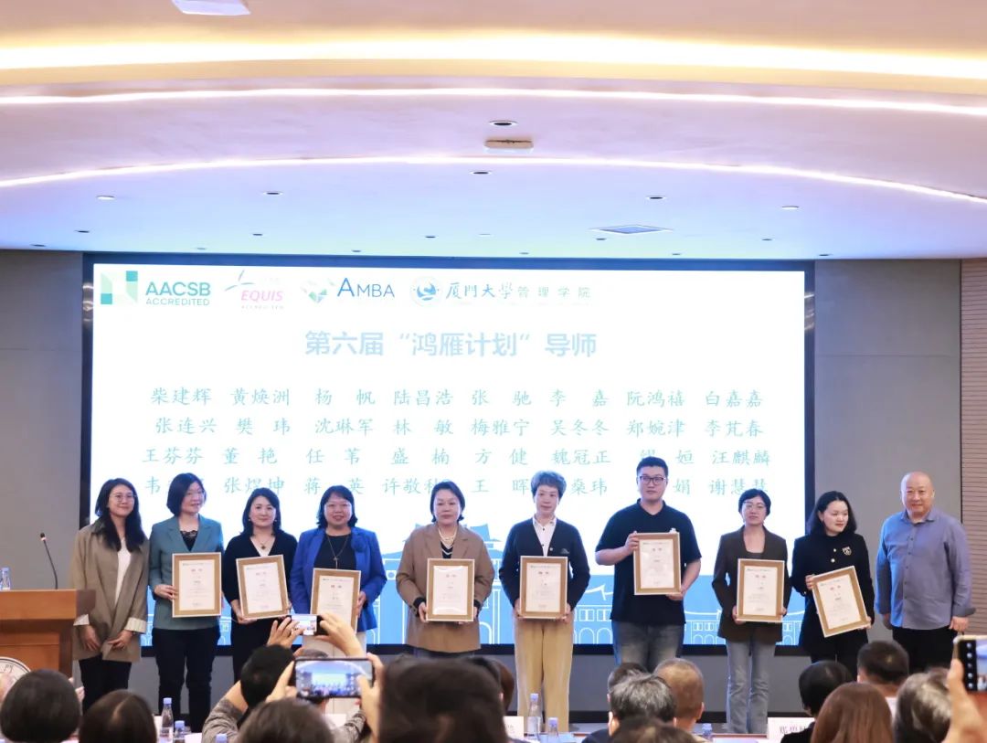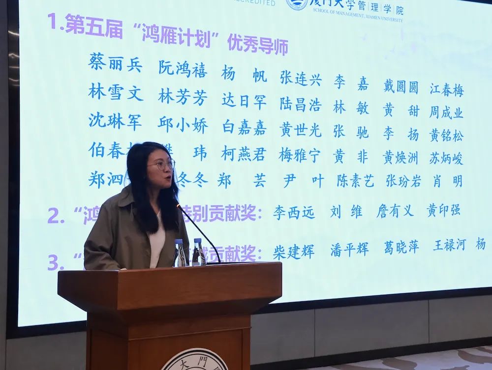 傅馨宣读了管理学院“鸿雁计划”优秀导师表彰决定。她表示,十年来,鸿雁导师们的努力与奉献为“小雁子”的成长提供了坚实的翅膀,今年在表彰第五届“鸿雁计划”优秀导师以外,对十年来担任过三届导师且至少获得一次优秀、担任过五届导师且至少获得两次优秀的鸿雁导师,分别给予特别贡献奖、卓越贡献奖表彰。这些奖项不仅是对过往成就的认可,也是对未来工作的激励。期待“鸿雁计划”继续助力更多“小雁子”实现梦想,飞得更高更远。
