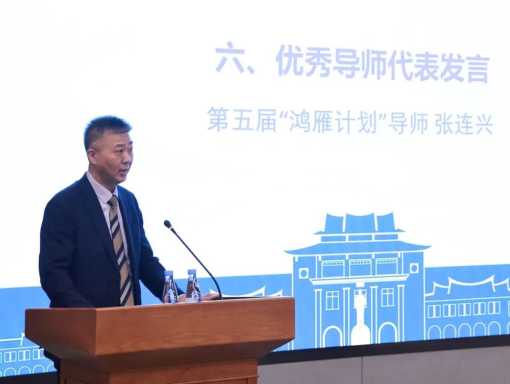 第五届“鸿雁计划”优秀导师代表张连兴致辞。他分享了自己从一名新导师成长为优秀导师的经历,鼓励学员们积极与导师交流,多参与社会实践和企业实习,了解不同行业企业的文化、商业模式、产品和市场等,找到自己喜欢的职业发展赛道。同时,作为企业导师,他表示将和其他导师一道,为“小雁子”们提供更多实习机会与成长资源。