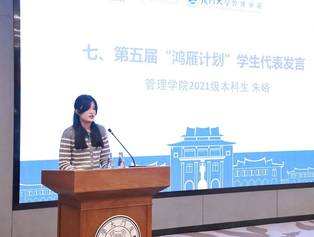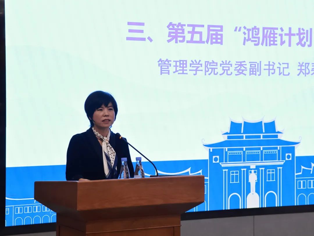 郑碧娇对第五届“鸿雁计划”进行了总结。她指出,管理学院“鸿雁计划”自2014年实施以来,至今已历经十载春秋,育人成效显著,五届鸿雁学子在这片沃土上茁壮成长、羽翼渐丰。“鸿雁计划”受到《光明日报》头版、教育部网站专题报道。第五届“鸿雁计划”通过“融合线上线下,多种方式增进师生交流;搭建育人平台,多种形式实现资源共享;构筑服务桥梁,多方联动实现校企共赢”等举措,进一步深化育人成效, 574名“小雁子”在116名鸿雁导师的带领下,取得了长足进步,收获了巨大成长。她希望同学们珍惜这难得的学习机会,积极主动加强与导师的联系沟通,从导师身上汲取智慧与力量,成为自信自强、刚健有为的新时代青年。