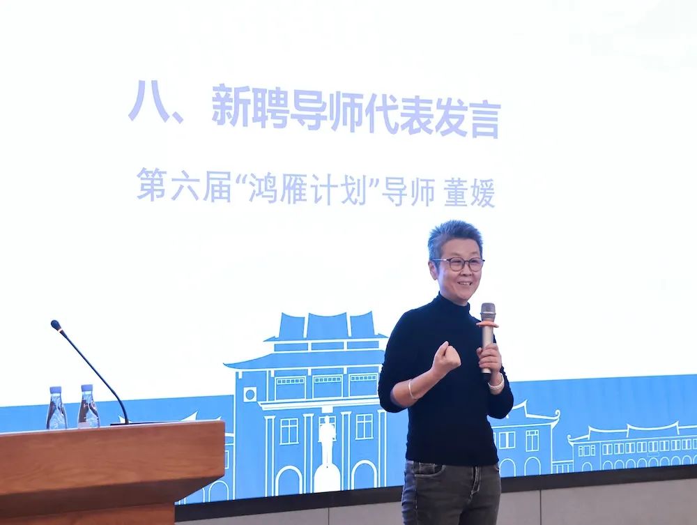随后,第六届“鸿雁计划”新聘导师代表董媛致辞。她结合AI时代的机遇和挑战,鼓励大家积极拥抱AI,注重创造力和人际沟通方面的发展,积极拓宽视野,提升思想新高度。她表示,将努力为“小雁子”们提供优质的指导和支持,充分发挥领头雁的作用。