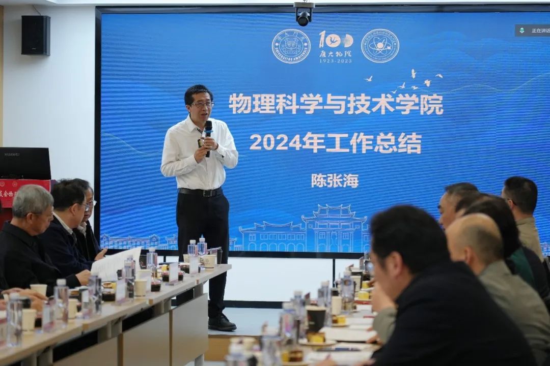 首先,物理科学与技术学院院长陈张海作学院2024年度工作总结报告。他展示学院2024年在学科建设、人才引培、教学科研等方面取得的成就。他表示,学院的发展离不开校友的支持,期待未来与校友会在产学研合作、学生实习就业等领域深化联动。