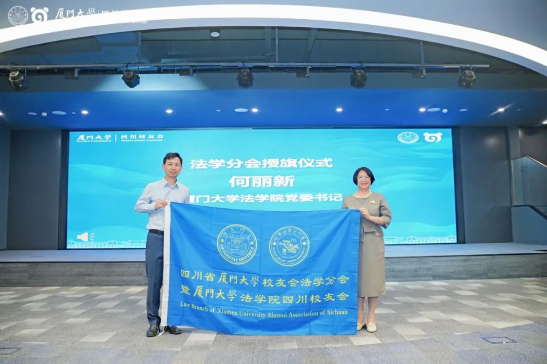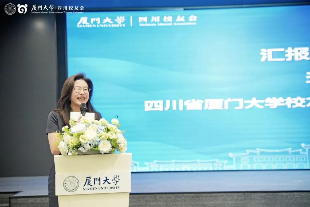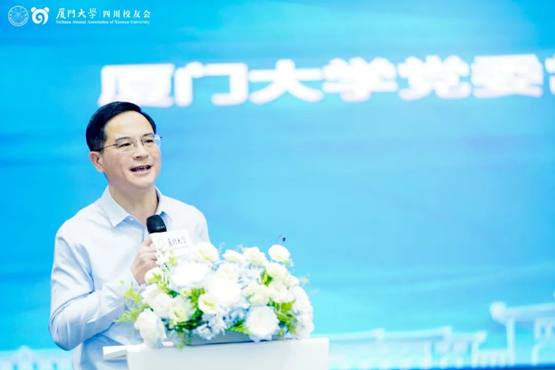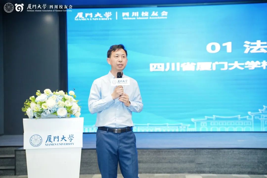 何丽新在发言中报告法学院建设与发展情况。她提出,法学分会成立标志着厦大法学在四川影响力进一步提升,并表示学院未来将加强与四川法学校友联动,支持西部法治人才培养,同时邀请广大四川法学校友明年相约回到母院,共同见证厦大法学学科百年盛典。