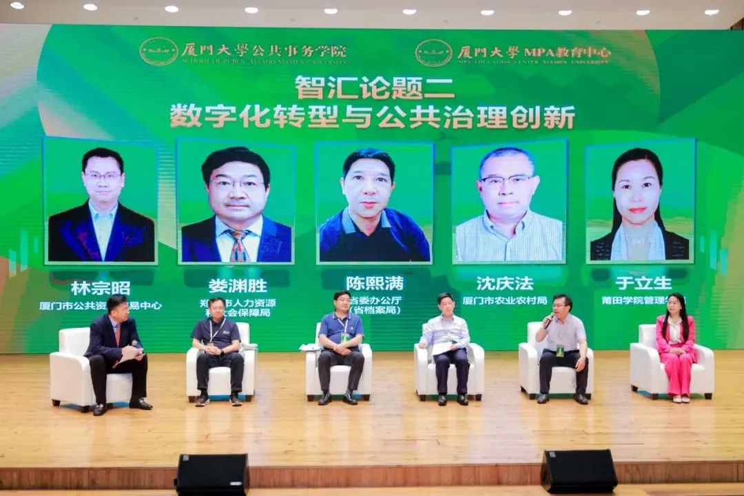 随后,论坛拉开序幕。论题“数字化转型与公共治理创新”由于文轩主持,2001级MPA校友、福建省档案局陈熙满,郑州市人力资源和社会保障局娄渊胜,2001级MPA校友、厦门市农业农村局沈庆法,2001级MPA校友、厦门市公共资源交易中心林宗昭,以及2001级MPA校友、莆田学院管理学院副教授于立生围绕主题展开深入探讨。五位深耕公共管理领域的实践者分别从档案管理、社会保障、农业农村、公共资源、医疗健康领域视角出发,详细解读了数字赋能是如何在实践中提升治理效能的。他们一致认为,数字技术的产生发展在不同程度上推动了公共管理部门信息的管理、流程的优化和质量的提升,在人工智能、大数据重构治理版图的时代,更应该将人工智能融入自身思维方式,提升“提问题”的能力,合理运用工具服务公共治理。