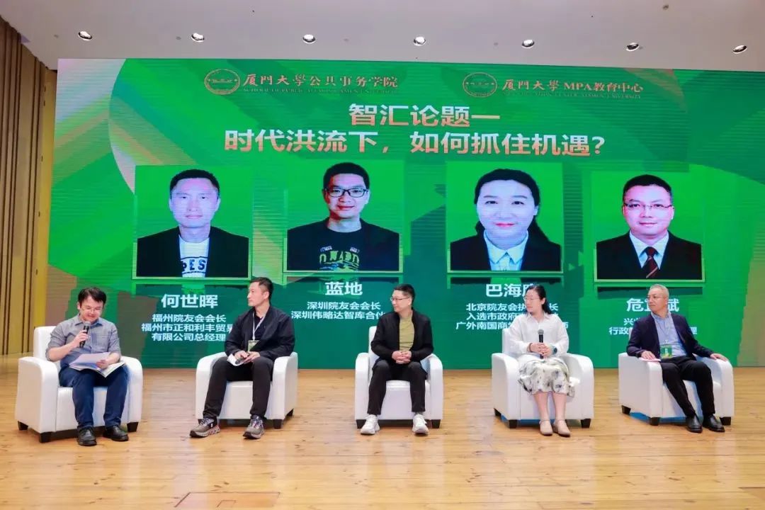 论题“时代洪流下,如何抓住机遇?”则由公共事务学院副院长李德国主持,2001级MPA校友、MPA深圳校友会会长、深圳伟略达智库合伙人蓝地,2003级MPA校友、MPA北京校友会执行会长、广东外语外贸大学南国商学院专任教师巴海鹰,2001级MPA校友、MPA福州校友会会长、福州市正和利丰贸易有限公司总经理何世晖,以及2001级MPA校友、兴业证券集团行政管理部副总经理危宜斌依次分享自身职业发展历程中把握时代机遇的宝贵经验。他们从深耕多年的行业实务出发,讲述了关于职业规划、能力培养、工具利用等多方面最真切的建议。从坚定自我信心到保持终身学习,从逆势破局到知行合一,真知灼见为与会者提供巨大价值的职业发展启示。