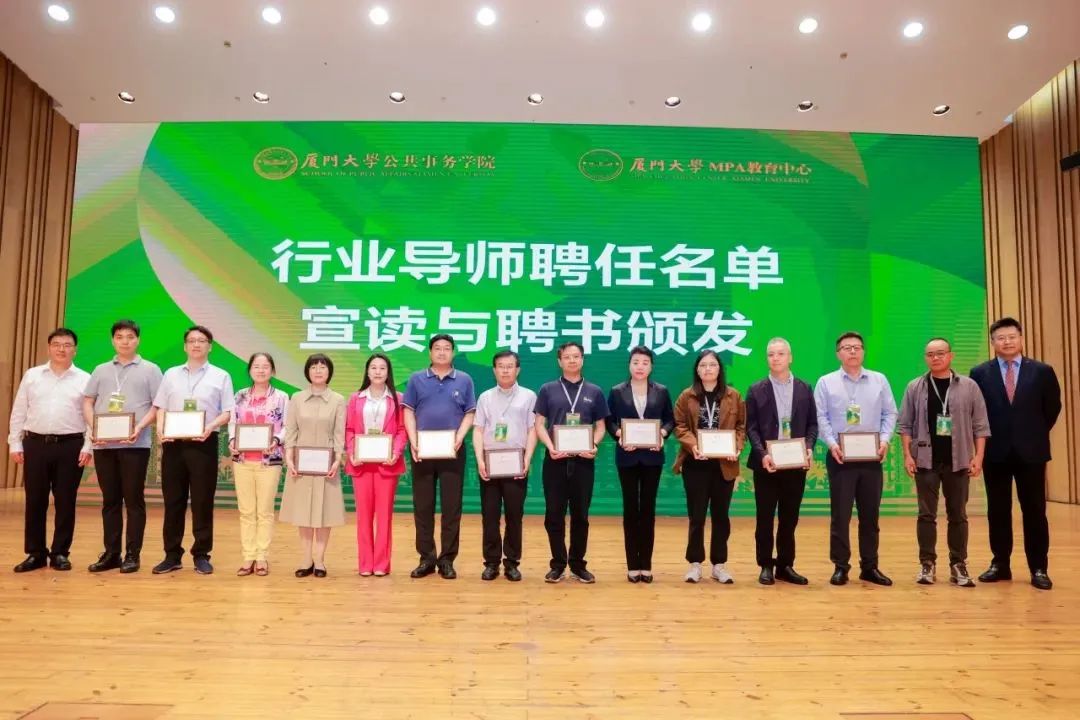 在观看《2025年度MPA行业导师智汇闪耀时刻》快闪视频后,主持人、厦门大学MPA教育中心主任徐国冲宣读厦门大学公共管理硕士专业学位2025年度行业导师聘任名单,崔庆炜、厦门大学公共事务学院院长于文轩为受聘导师颁发证书。