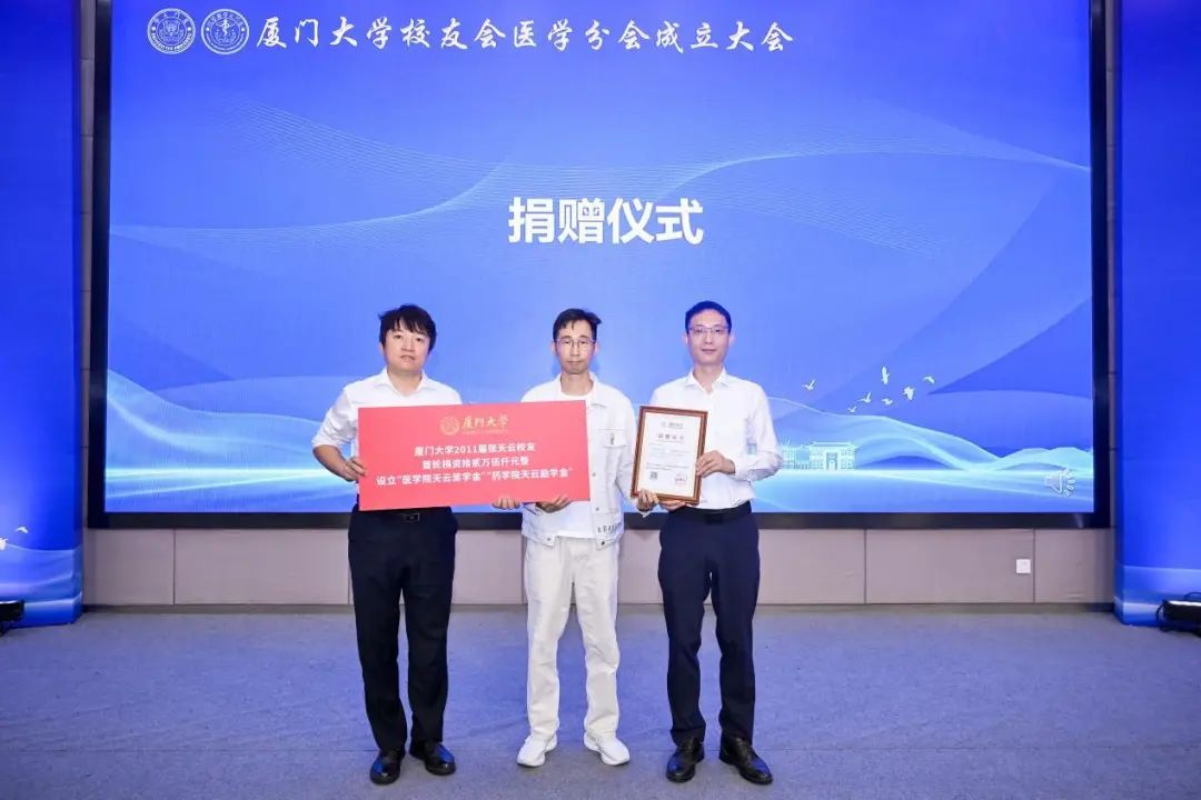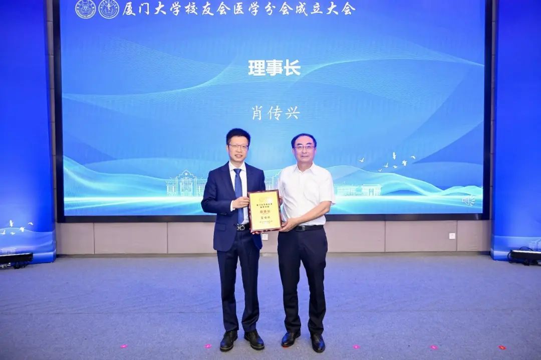 邱伟杰为厦门大学校友会医学分会颁授会旗、会牌。