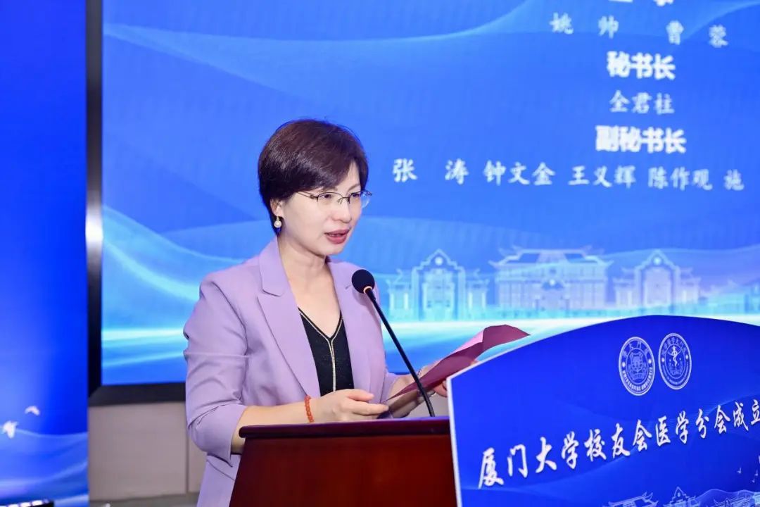 厦门大学校友总会秘书长王智兰宣读《厦门大学校友会医学分会第一届理事会、监事会和秘书处成员名单》。肖传兴任理事长,汤雅玲任监事长,全君柱任秘书长。