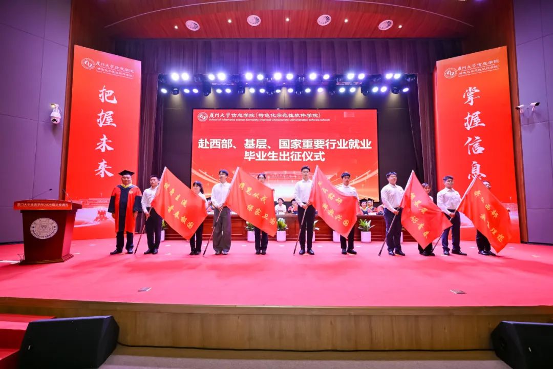 今年,学院共有904名学生圆满完成学业,即将毕业。其中,有267名毕业生到西部、基层、国家重要行业和领域就业。典礼上,袁飞代表学院宣读毕业生名单,并举行出征仪式,刘弢代表学院,向到西部、基层、国家重要行业和领域就业的毕业生代表授旗。“奔赴西部 放飞理想”“扎根基层 磨砺青春”“潜心钻研 科教兴国”“携笔从戎 保家卫国”“投身主流 青春报国”……一面面鲜红的旗帜,承载着学院的拳拳期许,更彰显着毕业生们的出征决心。