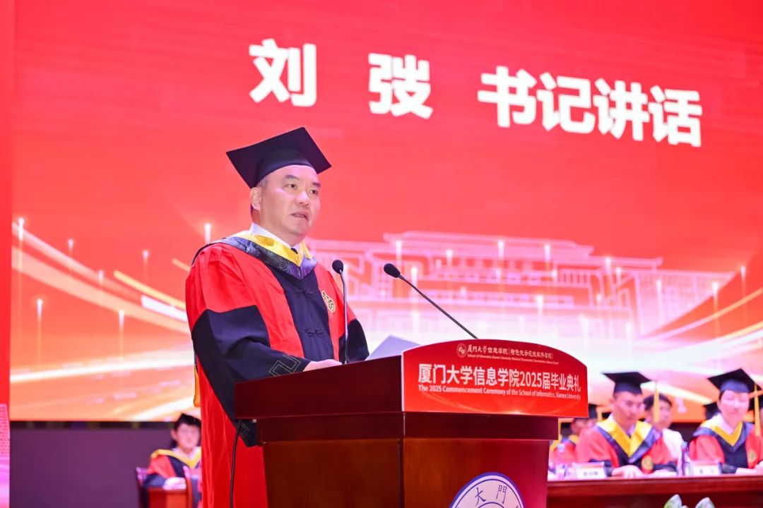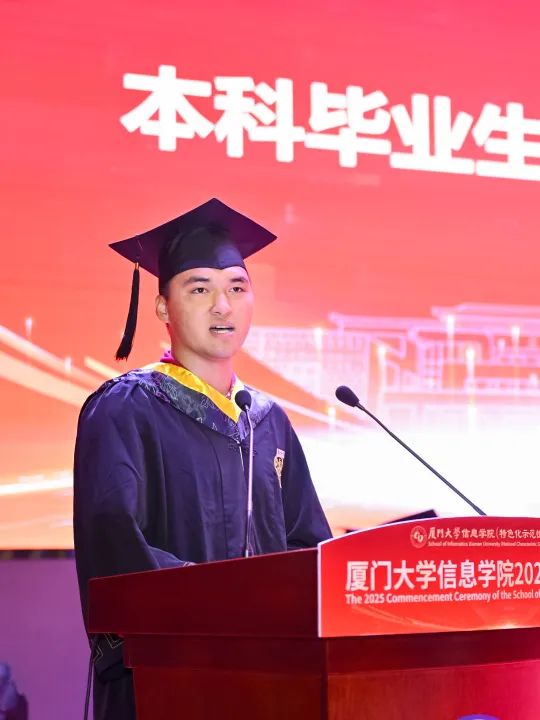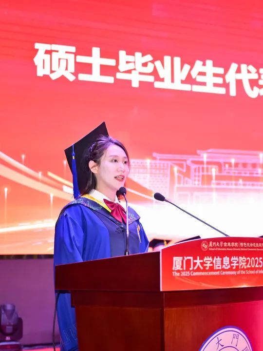 毕业生代表、2021级本科生马龙和2022级硕士研究生王妤妃发言。他们回顾了难忘的厦大信息学院求学时光,感恩母校母院,感恩师长同窗。他们表示,回望四年时光,母院教会了大家知识,更教会了大家胸怀“国之大者”、树立远大志向、勇攀科学高峰的勇气和追求卓越的信念。未来,要带着“四种精神”的烙印,带着在厦门大学、在信息学院积淀的力量,以代码为笔,以理想为墨,在时代的答卷上写下属于信息人的担当。