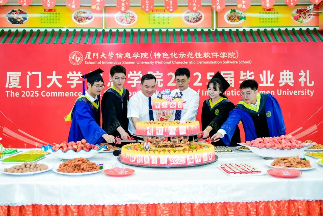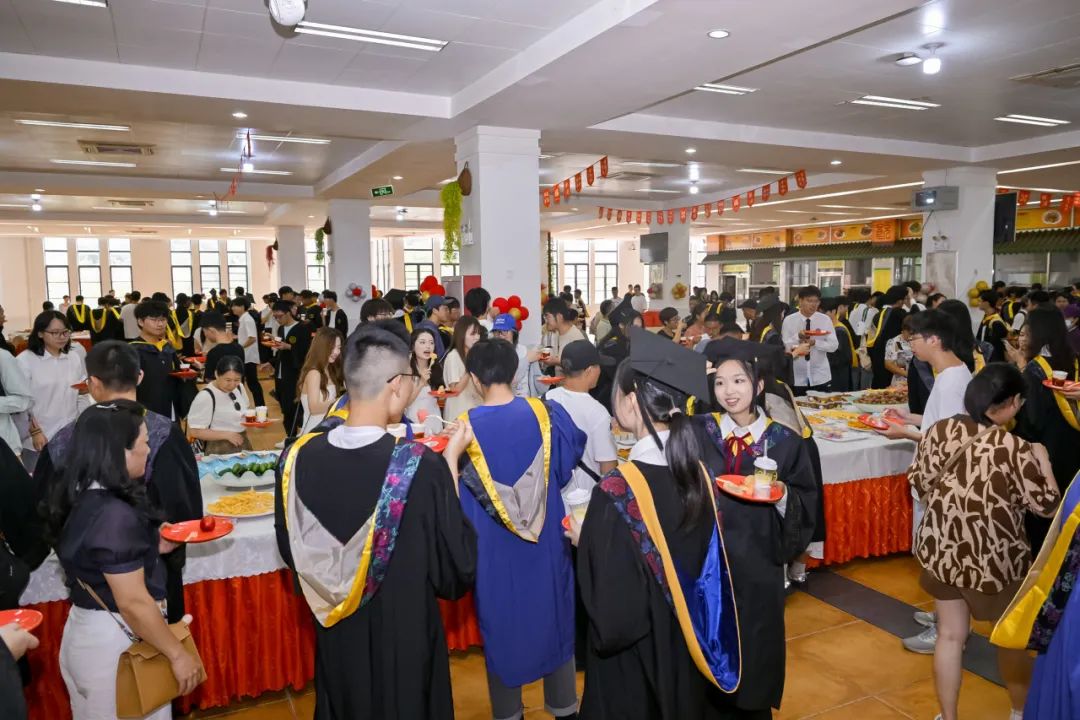 典礼结束后,师生和家长共同参加在丰庭餐厅二楼举办的冷餐会,在欢悦轻松的氛围中回忆过往的信息岁月,展望未来的远大前程。刘弢、向乔与毕业生代表共同切开象征着快乐、幸福的蛋糕,祝福毕业生们毕业快乐、前程似锦。