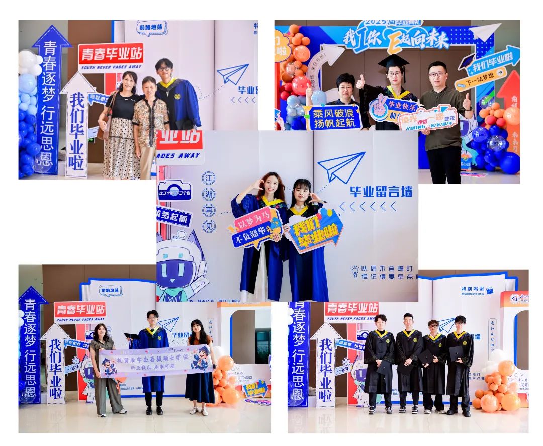 本次活动,学院设计了主视觉,并精心进行了校园氛围布置,包括设置校园主干道灯杆道旗,设置拍照打卡点、留言区等,为全天的活动增添了浓厚的氛围,也引得毕业生和家人朋友们纷纷驻足留影。