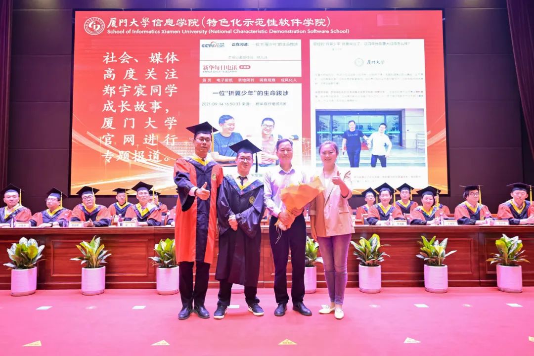 在今年学院的毕业生中,有一位郑宇宸同学。他出生时患上脑性瘫痪,右半身功能丧失,行动不便,在家人陪伴支持下,2021年考入厦大信息学院。四年来,郑宇宸同学自信乐观、顽强拼搏,圆满完成学业,即将参加工作。郑宇宸父亲郑卫无微不至,始终与他一路同行、共渡难关,成为郑宇宸身后最大的支持。父子俩积极阳光、奋发进取的心态和矢志不渝、笃行不怠的行动,令在场师生感动不已。在全场热烈的掌声中,郑卫搀扶着儿子上台,院长向乔为郑宇宸援正流苏。