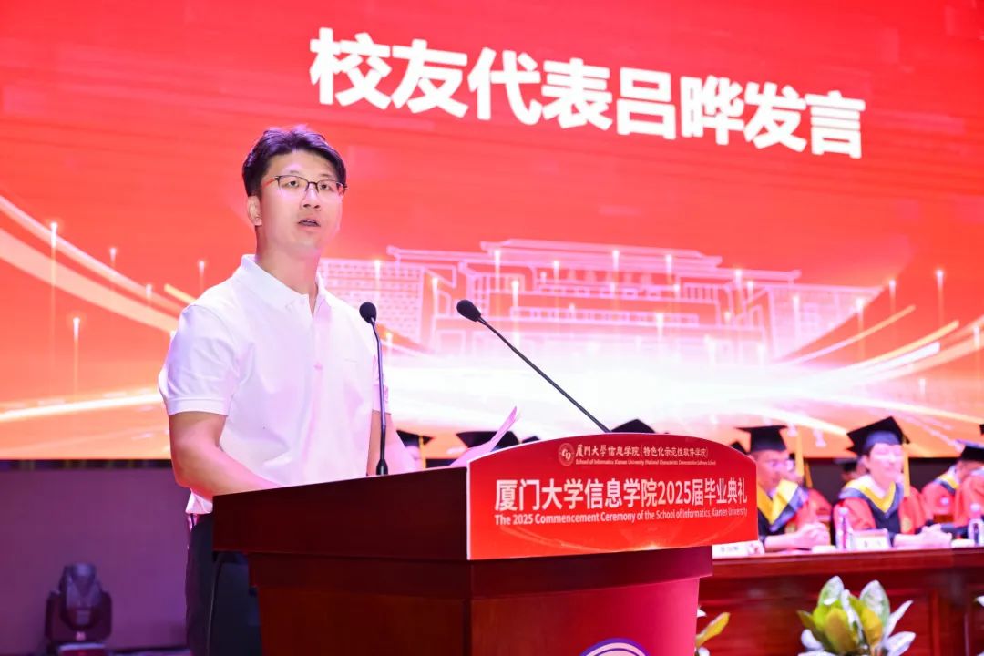 校友代表、信息学院杭州校友会副会长、星麦创始人兼CEO吕晔发言。他说,人工智能时代,变革不只发生在技术层面,更触及我们的认知边界和社会秩序。这是前所未有的机遇,更有未知的全新挑战。同学们要保持对AI技术前沿的敏锐,保持批判性思维和人文关怀,始终聚焦提升自我势能,勇敢地去探索、去定义、去实践属于自己的未来。