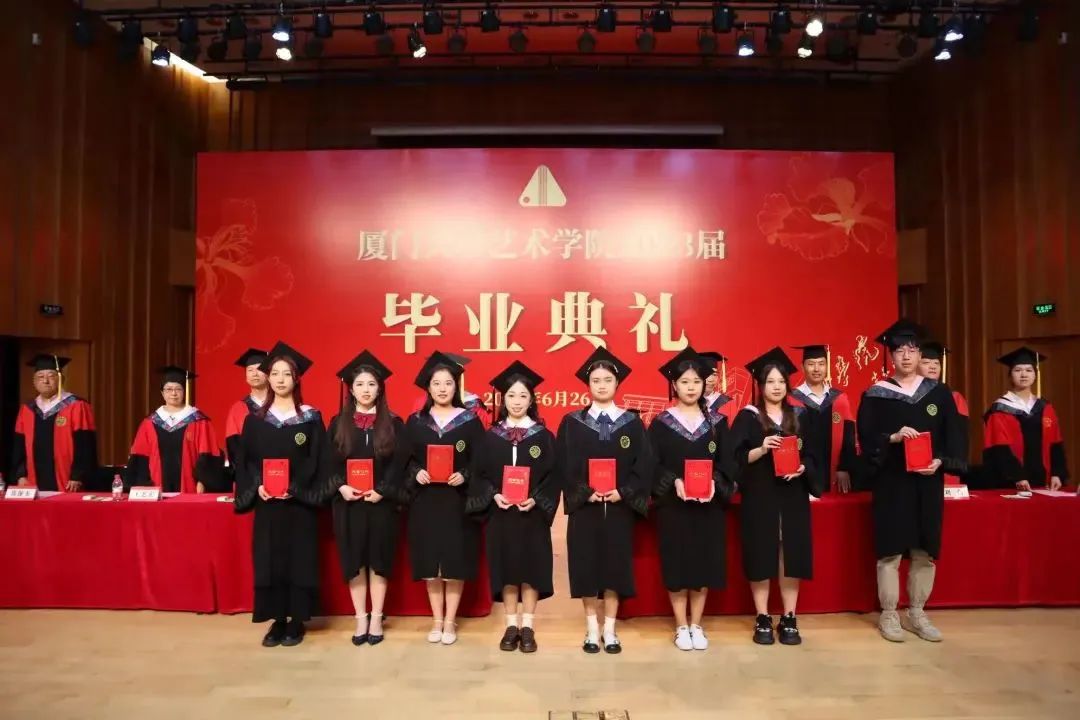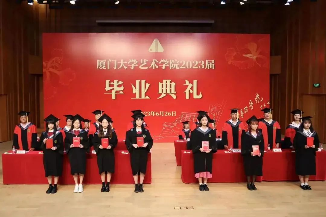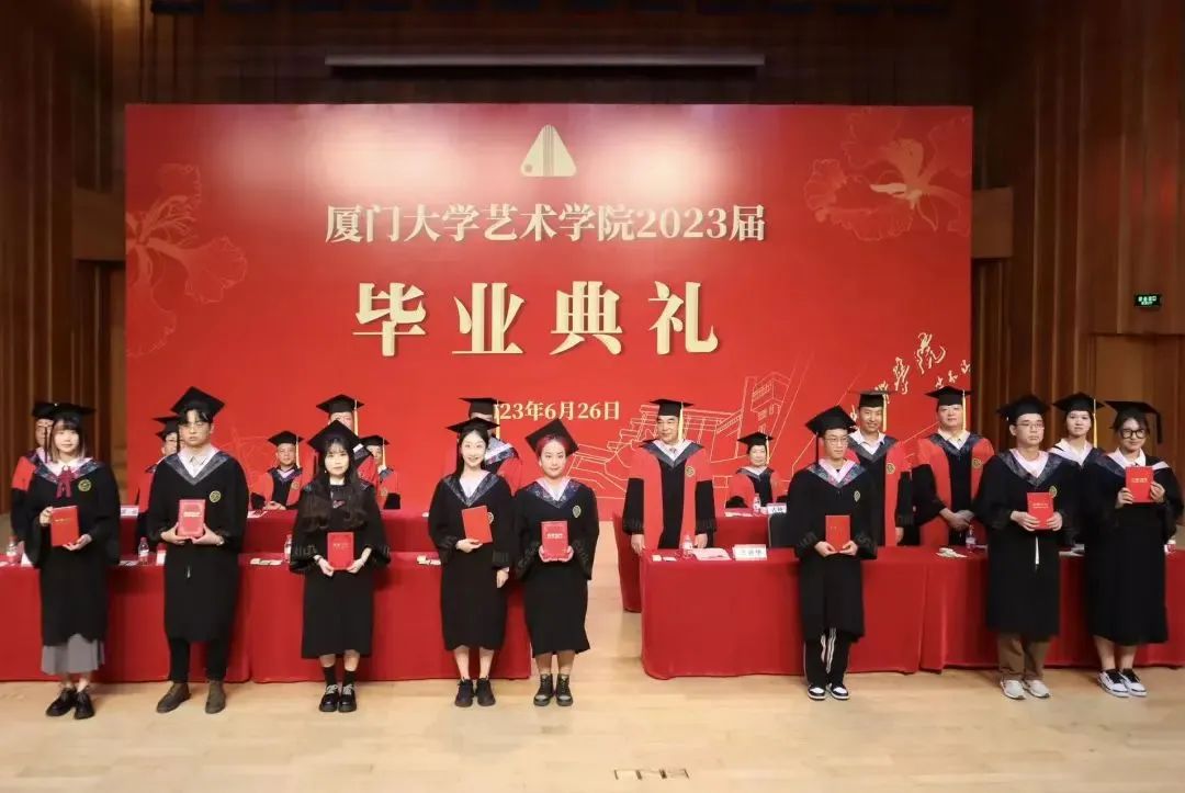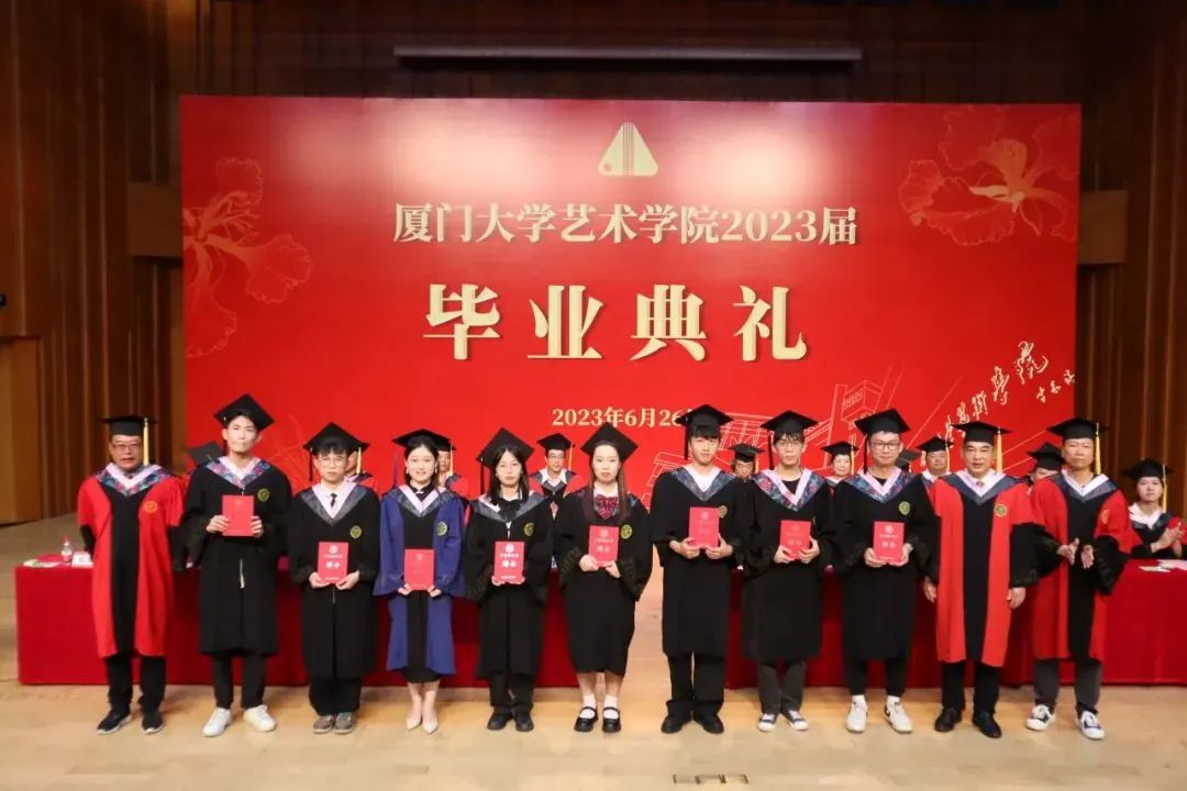为树选典型、表彰先进,典礼上,学院党委副书记王艺宏宣读《关于表彰厦门大学艺术学院2023届优秀毕业生的决定》,共32名同学荣获优秀毕业生称号,现场领导、来宾为优秀毕业生们颁发证书并合影留念。