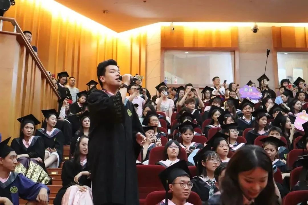 “又到凤凰花都开放的时候……”座位席里传出天籁之音,音乐系本硕毕业生陈龙慧、付昌坤、段欣欣、徐江涛领唱《凤凰花开的路口》《再见》,毕业生们摇臂欢呼“我爱你,再见”,将典礼气氛推向高潮。
