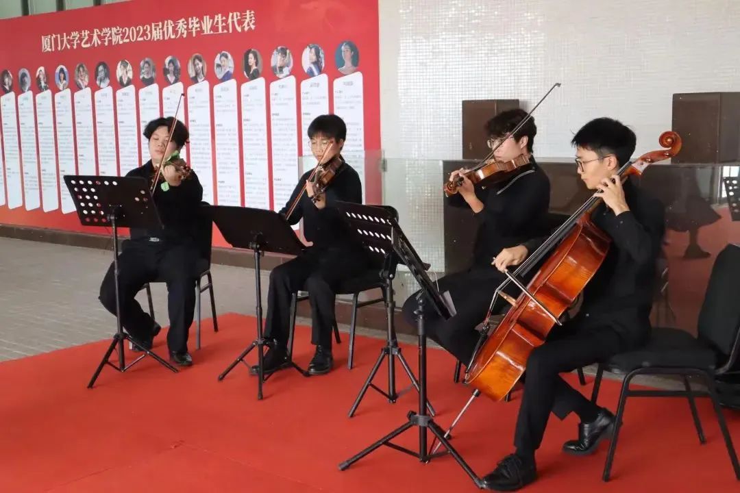 六月奏响骊歌,学子扬帆远航。6月26日下午,厦门大学艺术学院2023届毕业典礼在艺术学院大音乐厅隆重举行。入场进行时,毕业生踏着红毯进场,场外大厅里弦乐四重奏现场演奏迎宾曲,给毕业生们满满的仪式感。大厅还陈列着优秀毕业生代表风采展示墙,引得不少学生驻足合影留念。“艺术学院就是不一样,BGM都自己上!”步入场内,有管弦乐队演奏吹响欢乐的乐音,许毕业生一个与众不同的毕业典礼。