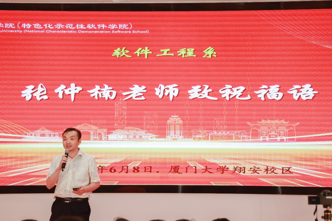 党委书记刘弢代表信息学院致辞,他回顾信息学院四年来的发展历程,总结办学经验与办学成果,表达学院对大家的深情嘱托与期望。他指出,学院坚持以立德树人为根本任务,以为党育人、为国育才为根本目标,以服务中华民族伟大复兴为教学使命,汇聚教学资源、科研资源、企业行业政府资源、校友资源、服务学生成长成才。他深情谈到,一朝厦大人,终身厦大情,你们始终是母校母院是老师们心中最深情的牵挂。寄语同学们以能担重担、可堪大用的自觉与自信,不负时代,不负韶华,以青春奋进之笔,书写属于自己的人生华章。