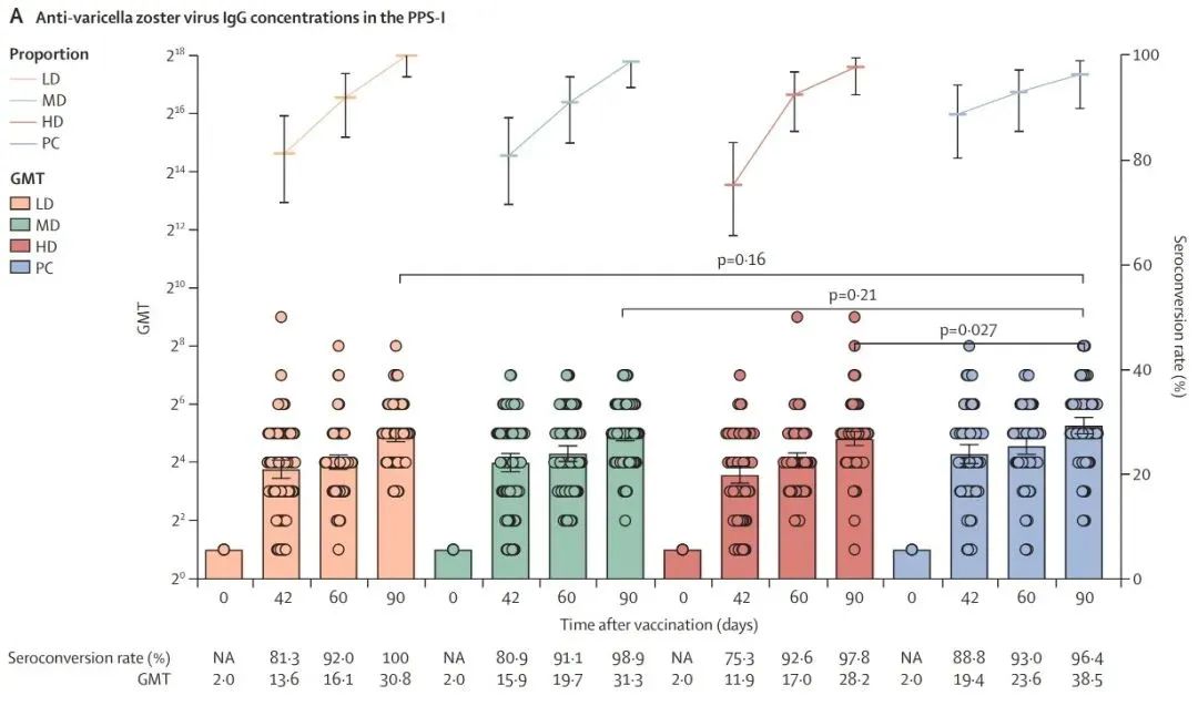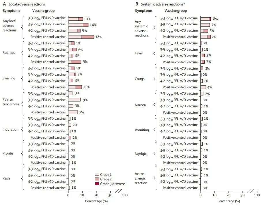 夏宁邵团队和万泰生物联合研发的一种嗜神经因子ORF7基因缺失的新型水痘减毒活疫苗(v7D)对人皮肤与神经细胞明显减毒,与现有vOka疫苗相比可能可明显降低疫苗株相关疾病的风险,具有成为新一代更安全的水痘减毒活疫苗的潜力。前期已在临床前和I期临床试验中初步验证了安全性和免疫原性(Nat Commun. 2022; 13(1):824;Lancet Reg Health West Pac. 2023; 34:100707)。为进一步全面评估v7D疫苗诱导的体液免疫和细胞免疫应答,研究团队于2020年在江苏赣榆开展了一项单中心、随机、双盲、阳性对照的IIa期临床研究。研究共入组了842名3-12岁健康志愿者,按1:1:1:1随机分配接种1剂低剂量、中剂量或高剂量的v7D疫苗或阳性对照(vOka)疫苗,评价疫苗的体液免疫及细胞免疫。在符合方案人群中,v7D疫苗的低、中、高剂量组与阳性对照vOka疫苗组的体液免疫应答和细胞免疫应答均相似。免后90天的抗体阳转率分别为100.0%、98.9%、97.8%和96.4%,平均抗体滴度分别为30.8、33.1、28.2和38.5;免后42天的细胞免疫应答阳转率分别为95.5%、90.5%、93.3%和88.0%,IFN-γ水平分别为87.0 pg/mL、122.0 pg/mL、89.0 pg/mL和96.0 pg/mL。v7D疫苗低、中、高剂量组的不良反应发生率低于vOka疫苗组(17%、20%、13%和24%,p=0.025),尤其是局部不良反应(10%、14%、9%和18%,p=0.016)。未发现与疫苗有关的严重不良事件。该研究结果提示v7D水痘疫苗的三个剂量组表现出与vOka疫苗相似的体液免疫和细胞免疫,并且安全性良好。