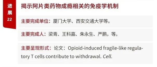 阿片类药物(可待因、吗啡、海洛因等)是常见成瘾性毒品,也是临床常用的麻醉性镇痛药物,但其具有强烈的致瘾性,断药后能诱发强烈的戒断症状。厦门大学王科嘉课题组的研究围绕外周免疫如何影响中枢神经活动这一关键问题,试图阐明外周免疫与成瘾行为之间的关联及其机制。该研究收集了21例阿片类药物成瘾人群和20例健康对照人群外周血单核细胞样本,通过质谱流式、转录组测序、流式细胞检测、小鼠体内研究等技术手段,揭示了成瘾人群外周免疫微环境变化,建立起脆弱样调节性T细胞与成瘾戒断行为的免疫学联系,有望通过免疫干预的方式治疗阿片类药物成瘾。2023年1月,该研究成果以“Opioid-induced fragile-like regulatory T cells contribute to withdrawal”为题发表于国际权威期刊《细胞》(Cell)上。