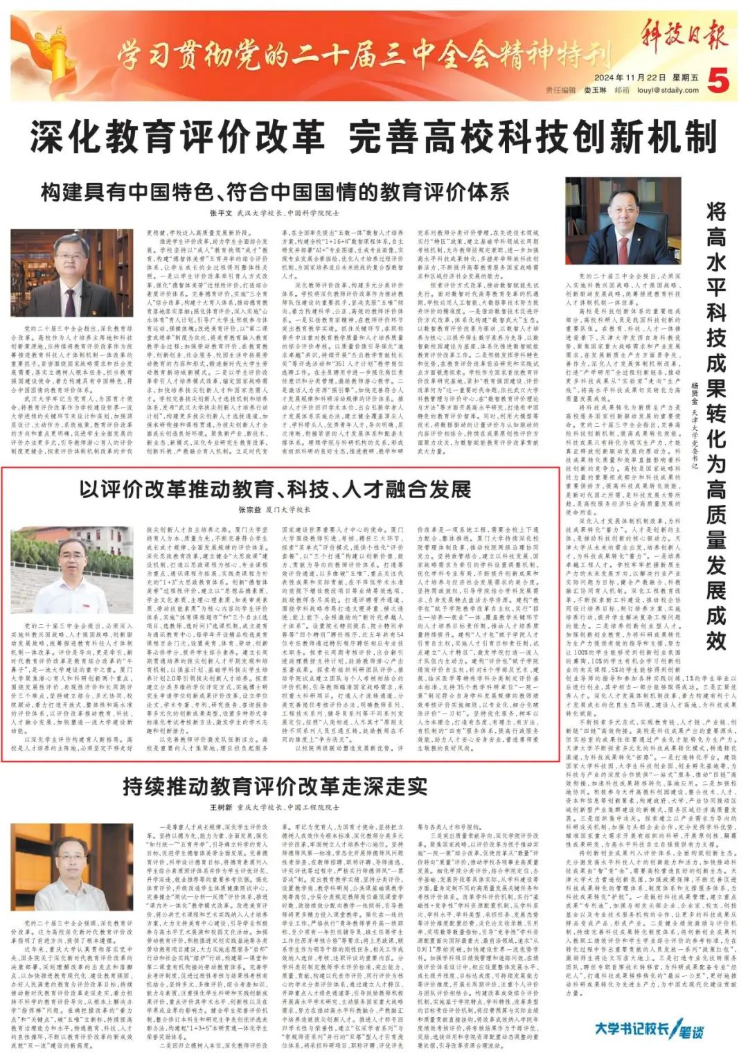 本期专版刊出武汉大学、厦门大学、重庆大学、天津大学四校领导结合各自学校实际,学习贯彻党的二十届三中全会精神的思路和举措的文章。其中,我校校长张宗益文章题为《以评价改革推动教育、科技、人才融合发展》。