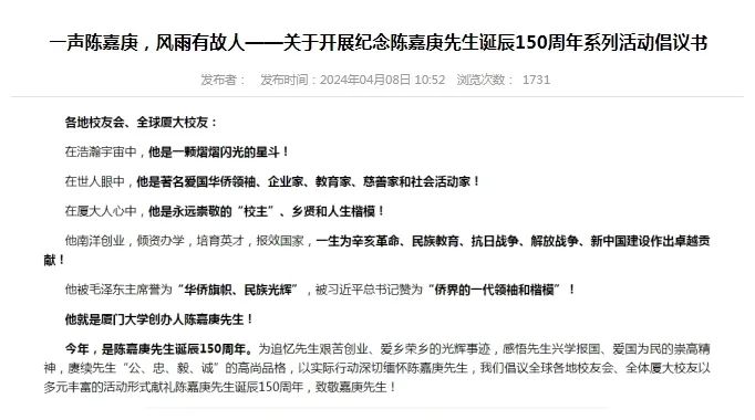 《一声陈嘉庚,风雨有故人——关于开展纪念陈嘉庚先生诞辰150周年系列活动倡议书》