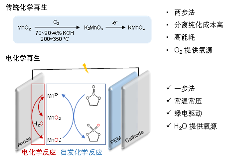 硫酸乙烯酯(DTD)是一种广泛使用的锂离子电池电解液添加剂,能有效提高电池的充放电性能和循环寿命。随着锂离子电池行业的快速发展,DTD的年需求量已超过1万吨。目前DTD主要是通过次氯酸钠或过氧化氢等强氧化剂在特定催化剂的作用下氧化亚硫酸乙烯酯而得,面临着环境或安全方面的挑战。高锰酸钾(KMnO4)是一种常用的强氧化剂,目前工业上通过分步法将副产物二氧化锰(MnO2)氧化再生KMnO4,面临着能耗高和分离纯化成本高等问题。如何简化KMnO4再生过程并与后续氧化反应耦合仍然面临着很大的挑战。