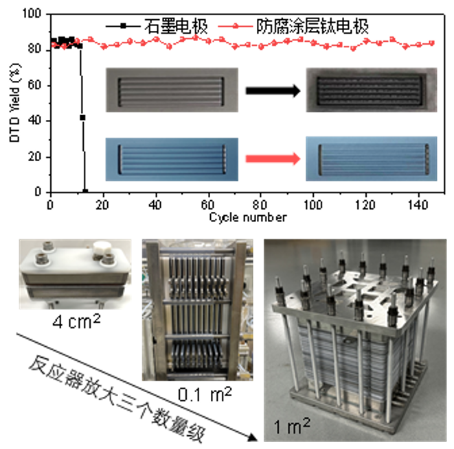 项目团队发展了电化学再生高锰酸根离子原位耦合有机物氧化的方法,通过引入脉冲电位抑制MnO2沉积,实现了MnO4-介导的连续化电合成DTD。与目前工业再生高锰酸钾的方法相比,电化学再生具有一步法无需分离、条件温和、可再生能源驱动和水提供氧源等优点。在深入认识MnO4-介导电化学氧化机理的基础上,项目团队开发了钛电极非贵金属防腐涂层,解决了传统碳基阳极易氧化腐蚀的难题,大幅提升了有机电合成阳极的寿命。项目团队利用自主研发的关键材料研制了有效面积0.1 m2 和1 m2的电堆反应器,实现了DTD法拉第效率70%、收率80%、生产速率0.5 kg h-1的性能,并且在连续运行80小时过程中保持稳定,展示了MnO4-介导的电合成DTD方法具有大规模应用的潜力。此项工作报道的原位电化学再生策略为有机电化学合成提供了新途径,突出了电化学反应工程在推动电化学合成走向工业化应用过程中的关键作用。