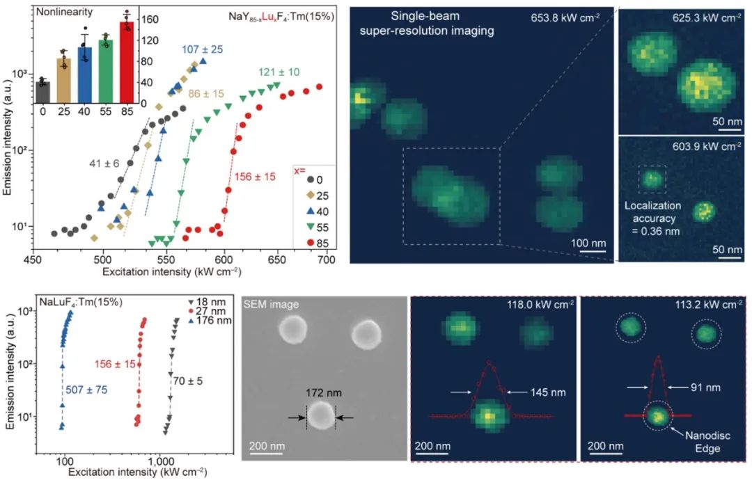 更值得关注的是,研究团队通过扩展光子雪崩正反馈网络,在直径为176 nm的光子雪崩纳米盘中实现了超过500阶的光学非线性,并首次揭示了激光扫描过程中光子雪崩效应在单个纳米粒子内部的区域响应差异,实现了“成像尺寸小于物理尺寸”的现象,有望突破传统探针尺寸对分辨率的限制。