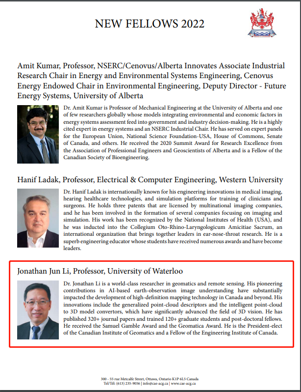 加拿大工程院对李军教授当选的评价是“Jonathan Li 博士是世界级的测绘与遥感研究人员。他在基于人工智能的地球观测图像理解方面的开创性贡献,极大地影响了加拿大及其他地区高清测绘技术的发展。他的创新包括广义点云描述符和点云到三维模型的智能转换器,这些都显著地推动了三维视觉领域的发展。他发表期刊论文320余篇,培养研究生和博士后120余人。他是Samuel Gamble奖和 Geomatica奖的获得者。他是加拿大测绘学会的当选主席和加拿大工程研究院院士”。