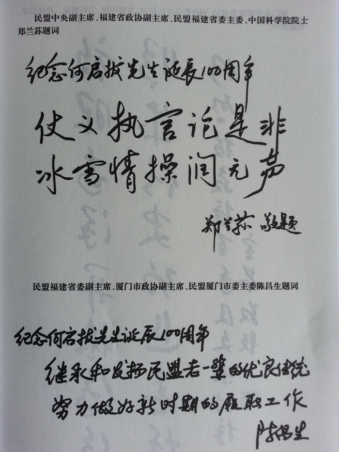 记得上个世纪九十年代初,在经历了“八九学潮”一阵子沉寂后,社会思想活跃,大家思进求变,各民主党派市委在这样的背景下经常性地开展一些学习座谈活动,学习贯彻中央会议和领导同志重要讲话精神、时事形势,基层组织生活内容多也是如此。何老对这样的会议几乎是每会必出席,每会都必作发言的。何老发言给人几点深刻的印象:一是他总是在听取若干位同志发言后作发言的,发言慢条斯理、不乏柔中带刚,时间也比较长,至少总在十多分钟以上,有时甚至要主持人提醒后才会停止;二是他经常情不自禁地会提起他年轻就学就教“西南联大”时期,见识民盟先贤如闻一多、吴晗、费孝通等大家风范的往事,说到动情处,他会突然提高嗓门,感叹时下民主党派人士正在缺失老一辈的“仗义执言”精神,呼吁盟组织要重视对中青年盟员特别是新吸纳盟员的盟光荣优良传统教育;三是他发的发言是有备而来,发言内容有高度、有针对性,说明他会前有关注了解,认真思考,虽说年事已高,退休多年,但政治敏感性强,思想一点也不落伍。如1992年11月4日,民盟市委召开盟内部分专家、学者学习贯彻中共十四大精神座谈会,何老发言说,“党的十四大可与党史上著名的西柏坡会议(七届二中全会)相提并论。七届二中全会奠定了‘中国人民站起来’的基础,之后诞辰了新中国,十四大则是‘站起来的中国人民’向现代化国家迈进的动员大会。十四大确定的社会主义市场经济,将进一步解放生产力,推进改革开放,经济繁荣。但还有许多工作要做,要引入公平竞争原则,要加强民主与法制,只有这样才能消除腐败现象,才能把经济搞上去。”又如1993年7月17日,民盟市委召开“如何办好集美大学”座谈会,何老在会上表示:“十分赞成省市政府将五所院校合并成立统一的集美大学的决定,如此可以整合力量资源共享,做强做大。但我建议未来的集大应当实行董事会领导下的校长负责制,校长全权负责学校事务。”