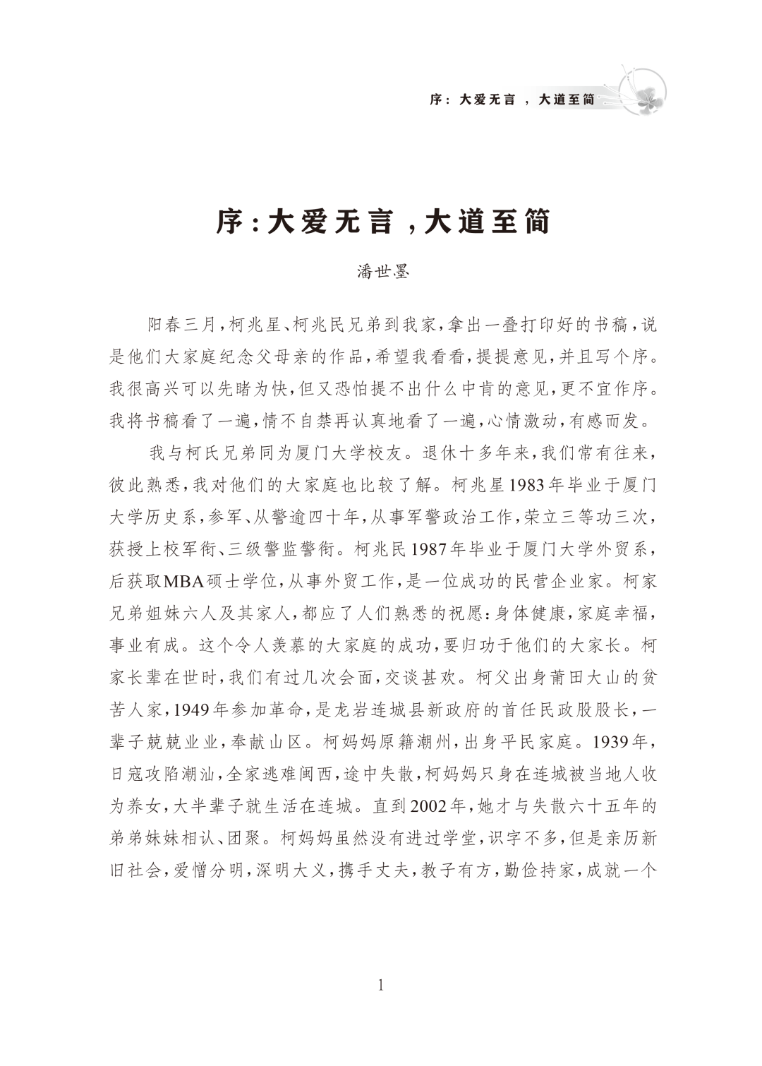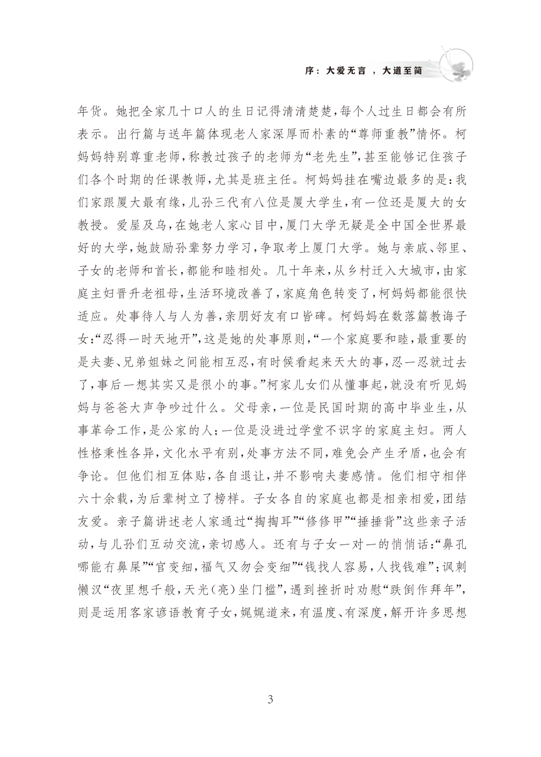 书中妈妈目不识丁,因而特别注意引导孩子敬重老师(“老先生” ),家中三代有了八个厦大人;妈妈幼时饱受侵华日军带来的战乱之苦,因而让多个孩子从军报国,家中五个孩子穿上了军装。大道至简,大爱无言,全书中,妈妈没有一句华丽词藻,却用平凡通俗的语言,令她的孩子们受益终生。