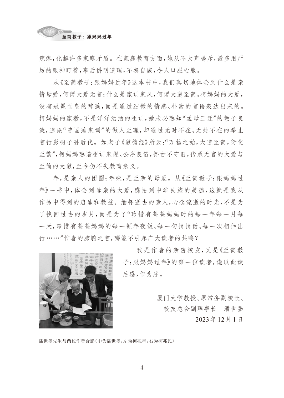 近日,《至简教子:跟妈妈过年》一书,由厦门大学出版社出版。该书作者柯兆星、柯兆民以亲身经历与感悟,历时十年,联袂写成,通过“年”这个截面,全景展现了6个孩子跟妈妈过年的亲子温馨画面、6个孩子的成长轨迹。