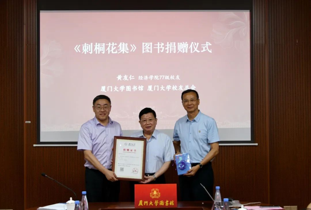 6月26日下午,我校经济学院财政金融专业1977级校友黄友仁作品《刺桐花集—黄友仁诗词选》(下称《刺桐花集》)图书捐赠仪式在思明校区图书馆举行。