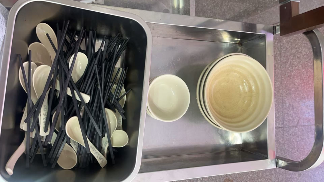 大家都安安静静吃饭,就坐,秩序井然。每个人都会把饭菜吃得干干净净,一点米粒菜叶都没有。在离场的时候把碗筷放在门口的收碗区,吃过的碗筷像洗过一样干干净净。