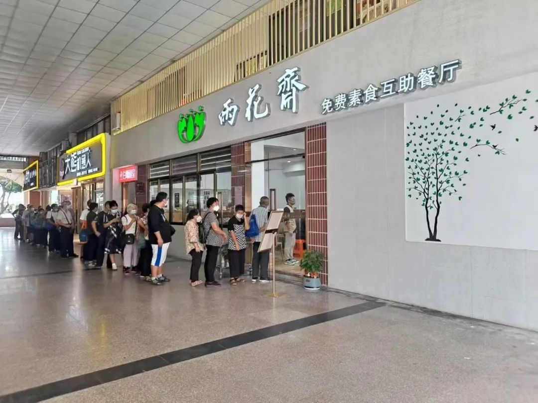 上午11时,还没到中午饭点时间,雨花斋免费素食互助餐厅(福津大街店)门口就已排起一列整齐长队,人们翘首以盼等待餐厅营业。餐厅内,一锅锅热气腾腾饭菜新鲜出炉,端菜、摆盘、摆放桌椅……工作人员热火朝天,手脚麻利地做着餐前准备。见此情景,可能有人会以为这是一家生意火爆、赚得盆满钵满的网红餐厅,但实际上这家餐厅既没有价目表,也没有收银台——它完全免费。
