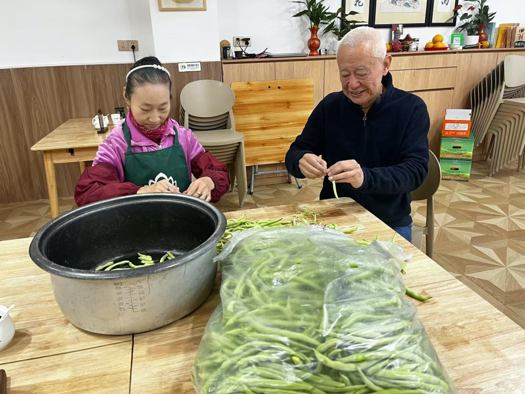 很多老人吃了一段时间后,表示肠道更通畅,血压血脂更稳定,所以这里60%的吃饭老人都比较固定,基本每天早早就来到门口等待开餐。有时候他们也会帮忙摘菜,刮皮,一起参与到劳动中。比起一个人在家里对着电视发呆,这里更像一个其乐融融的大家庭。